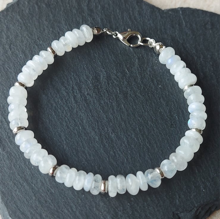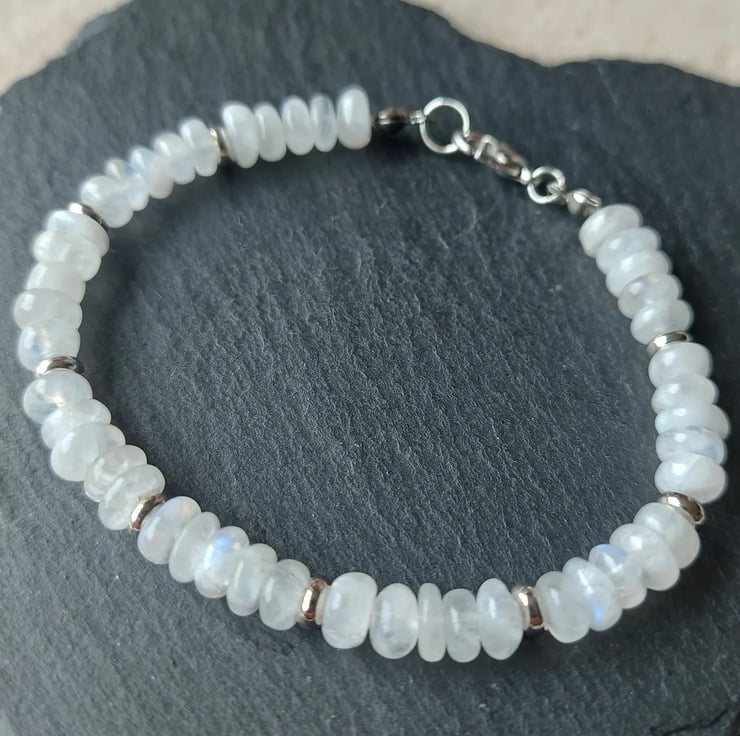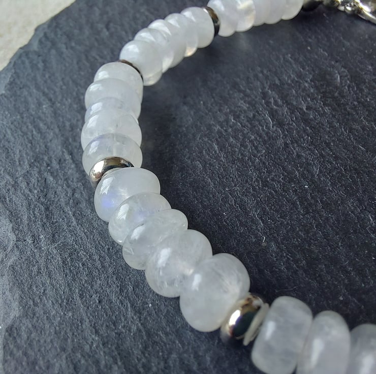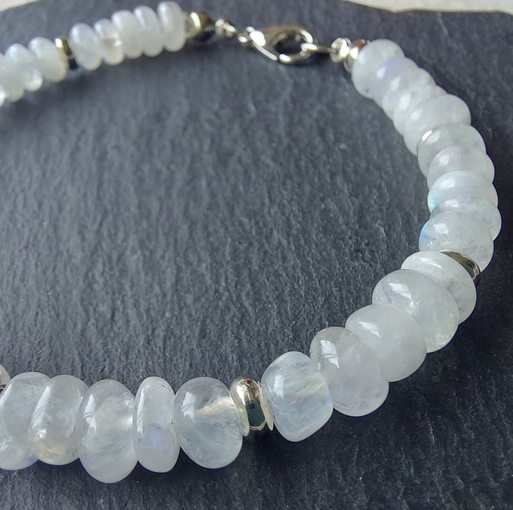 A gorgeous semi-precious white Moonstone nugget bracelet, with silver-tone findings. Wrist size up to 7.25"/18cm. Lobster clasp.