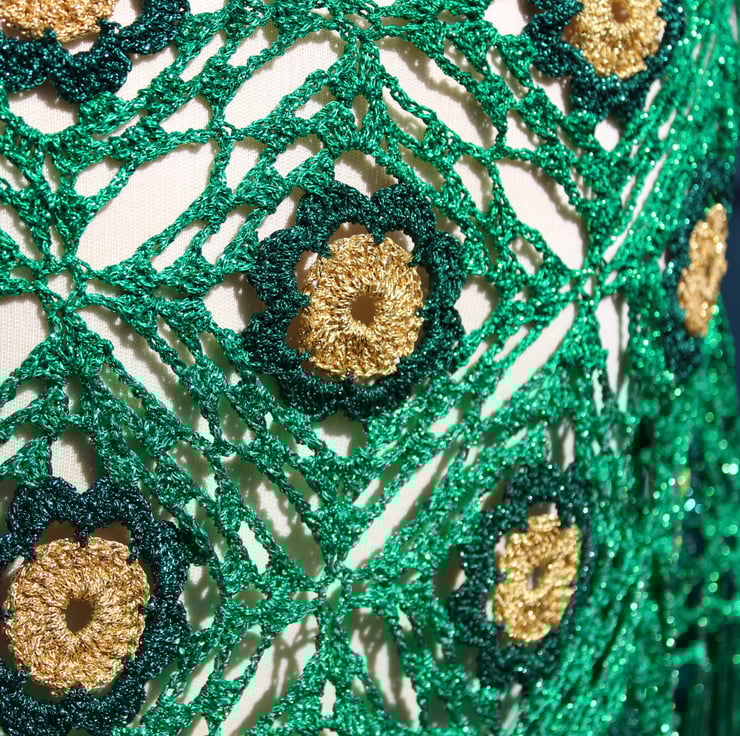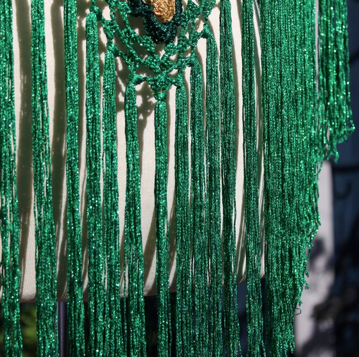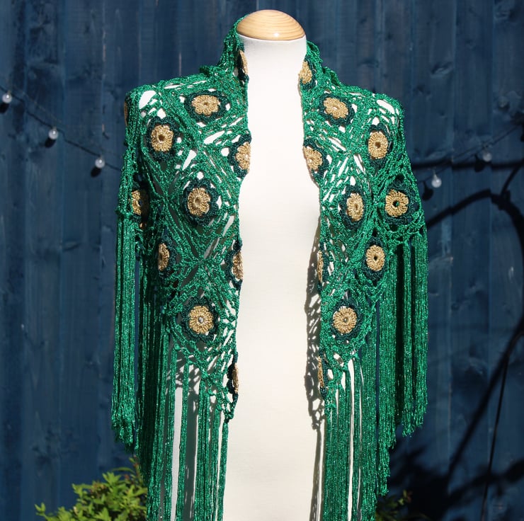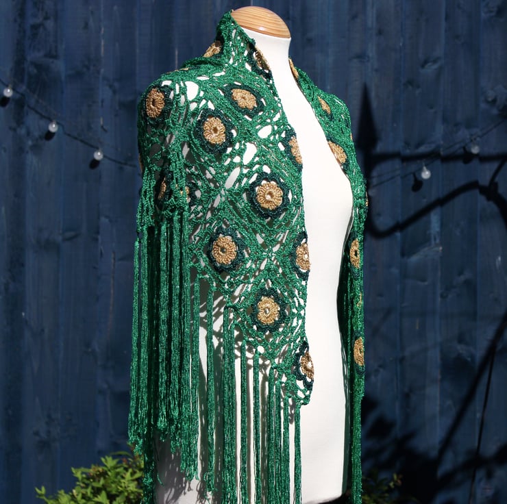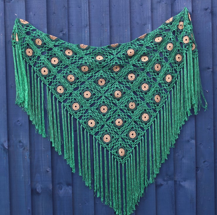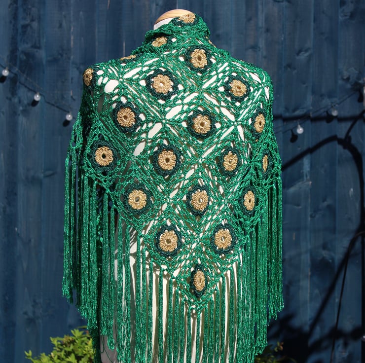 This crocheted fringed triangular shawl is made using genuine vintage Twilley's Goldfingering thread in gold, forest green and emerald green, using one of their patterns published in 1978. The use of these vintage materials not only adds a unique charm to the shawl but also ensures its quality and durability. Designed during the disco era and crafted in recent years — very retro, very sparkly, very swishy fringing. When the sun hits this shawl, it creates a mesmerising display of sparkles!