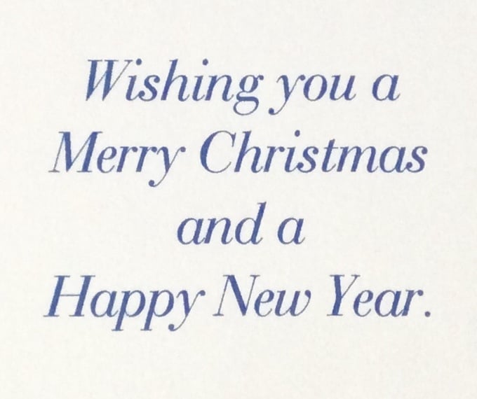 The message inside reads "Wishing you a Merry Christmas and a Happy New Year" in navy lettering.