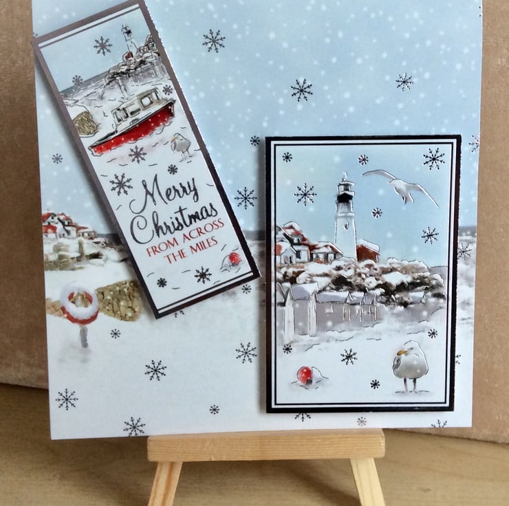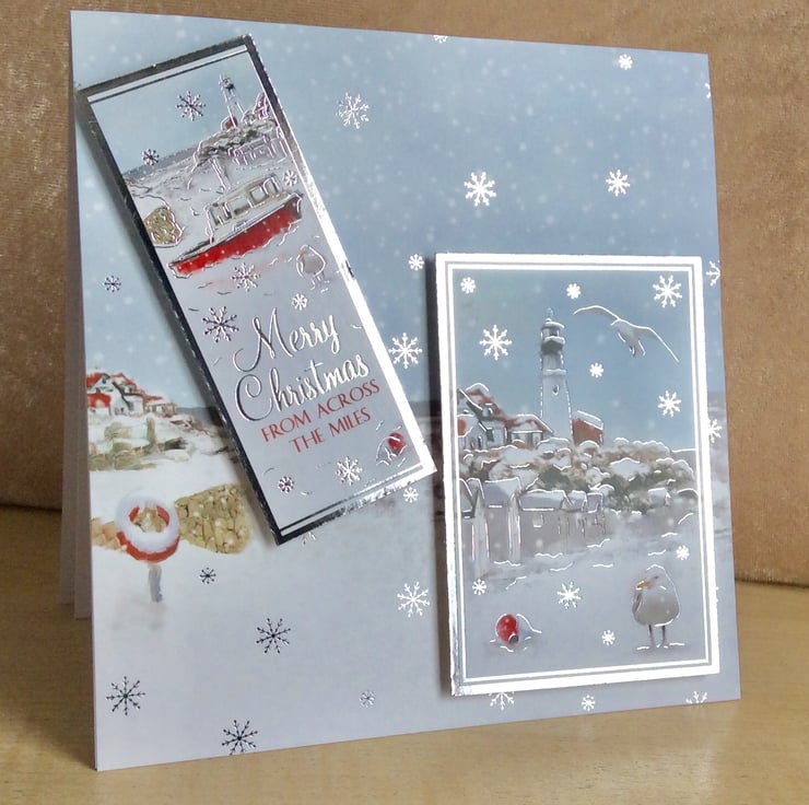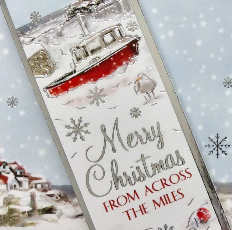 This printed card features images of a snowy coastal scene with a boat and lighthouse against a backdrop of metallic silver snowflakes. The images have silver highlights and borders to add even more sparkle. The greeting reads "Merry Christmas From Across The Miles".