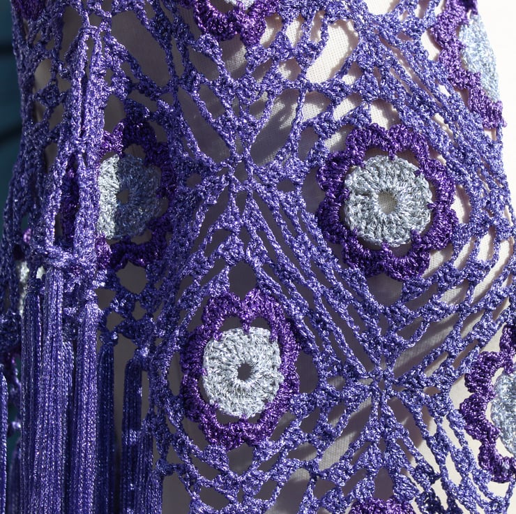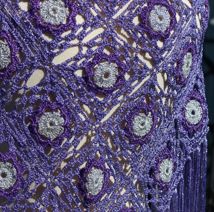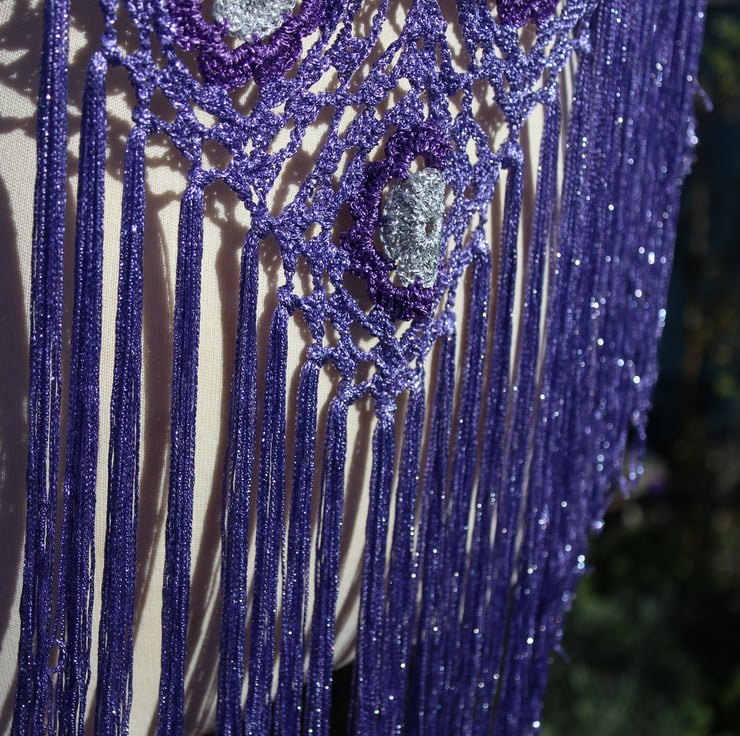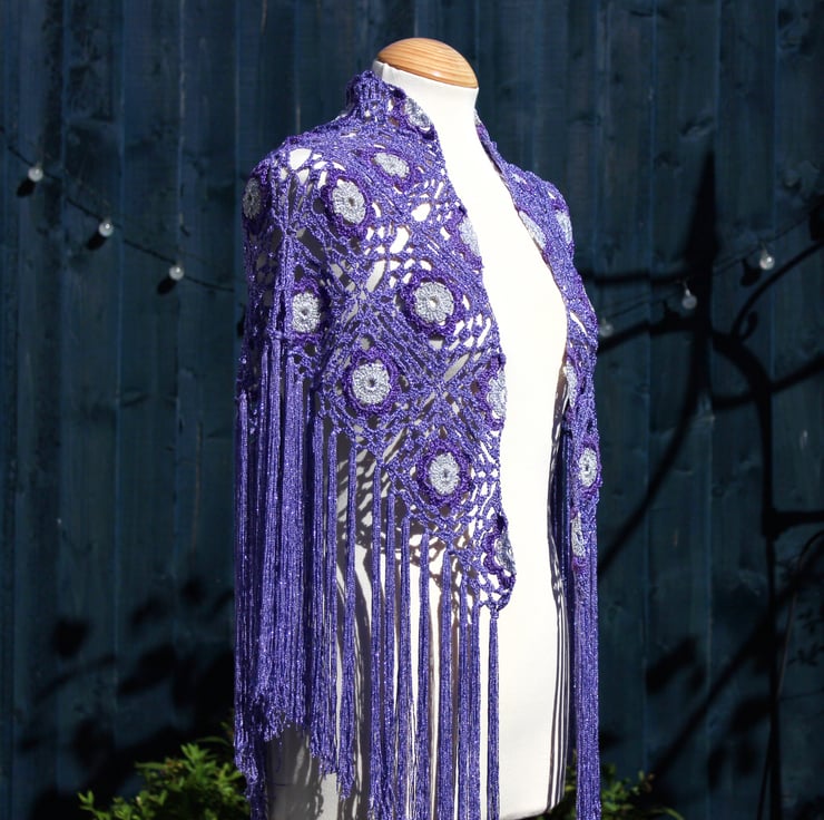 This crocheted fringed triangular shawl is made using genuine vintage Twilley's Goldfingering thread in silver, purple and lilac, using one of their patterns published in 1978. The use of these vintage materials not only adds a unique charm to the shawl but also ensures its quality and durability. Designed during the disco era and crafted in recent years — very retro, very sparkly, very swishy fringing. When the sun hits this shawl, it creates a mesmerising display of sparkles!