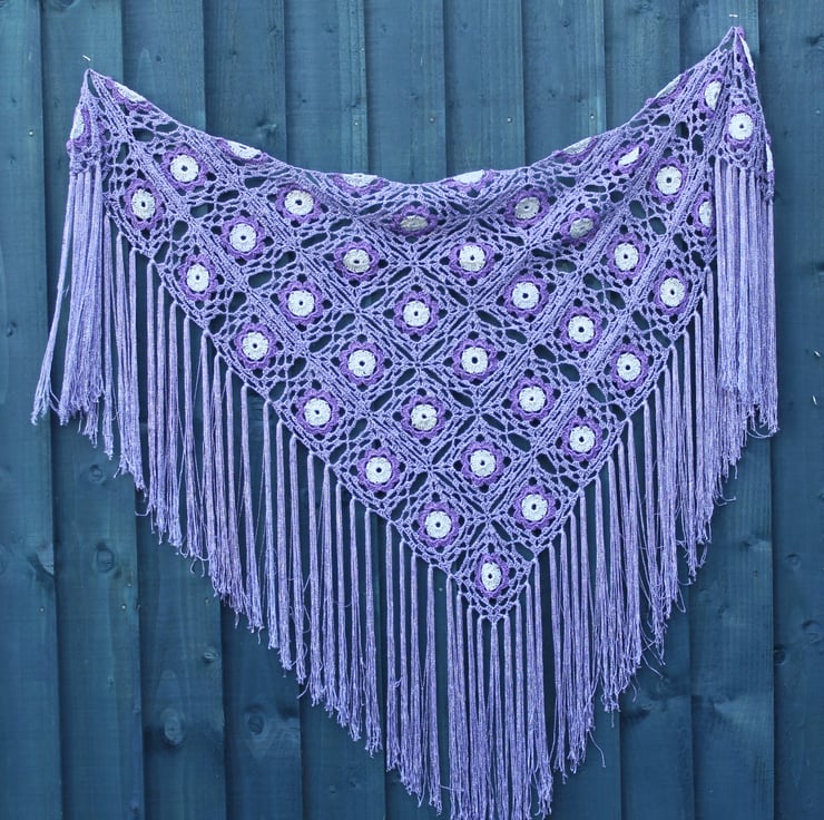 Crochet triangular shawl in sparkly silver, purple and lilac - design LF433