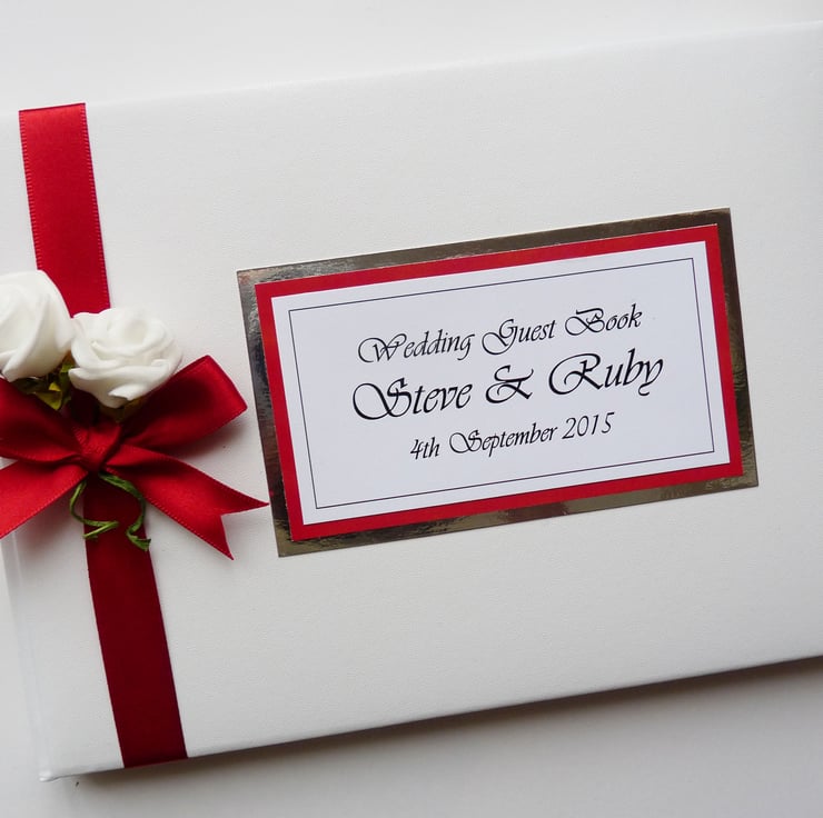 This Wedding Guest Book is decorated with embellishments and a ribbon.