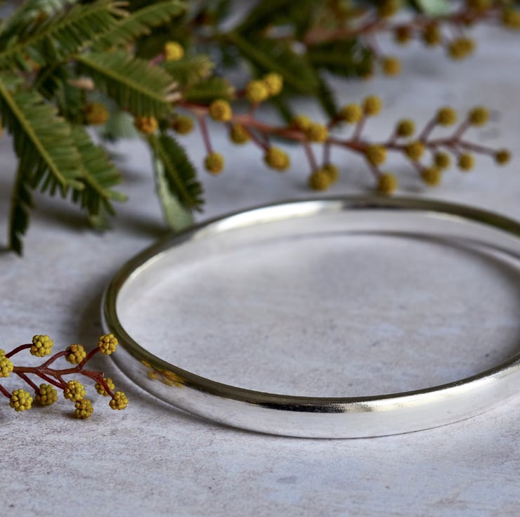 A chunky sterling silver bangle made from 6mm oval wire, shaped into an oval for a more ergonomic design and finished with a high shine. Weighing approx. 30g this is a statement piece to ass to your collection, to wear on its own or part of a stack.