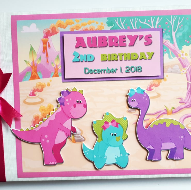 Dinosaurs girl birthday guest book, Cute pink dinosaurs party keepsake, gift