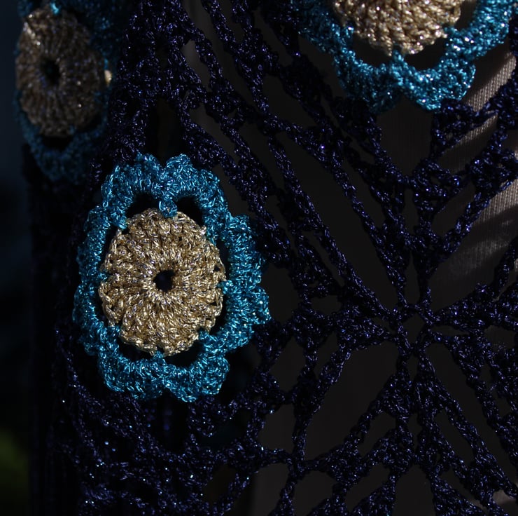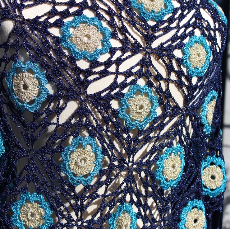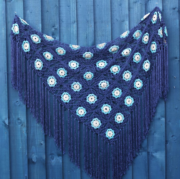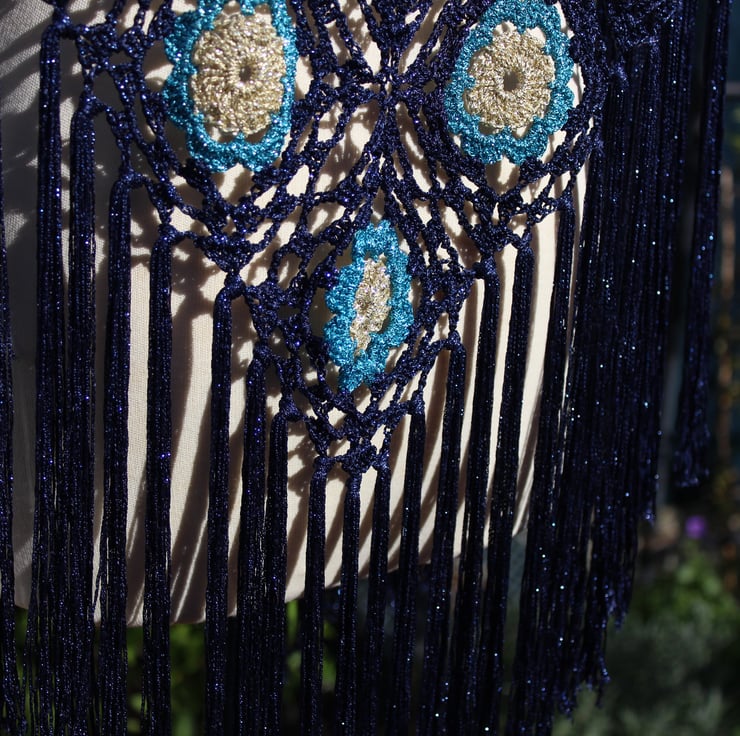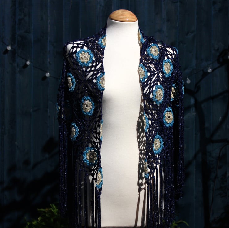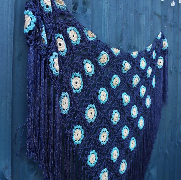 This crocheted fringed triangular shawl is made using genuine vintage Twilley's Goldfingering thread in pale gold, turquoise and navy, using one of their patterns published in 1978. The use of these vintage materials not only adds a unique charm to the shawl but also ensures its quality and durability. Designed during the disco era and crafted in recent years — very retro, very sparkly, very swishy fringing. When the sun hits this shawl, it creates a mesmerising display of sparkles!