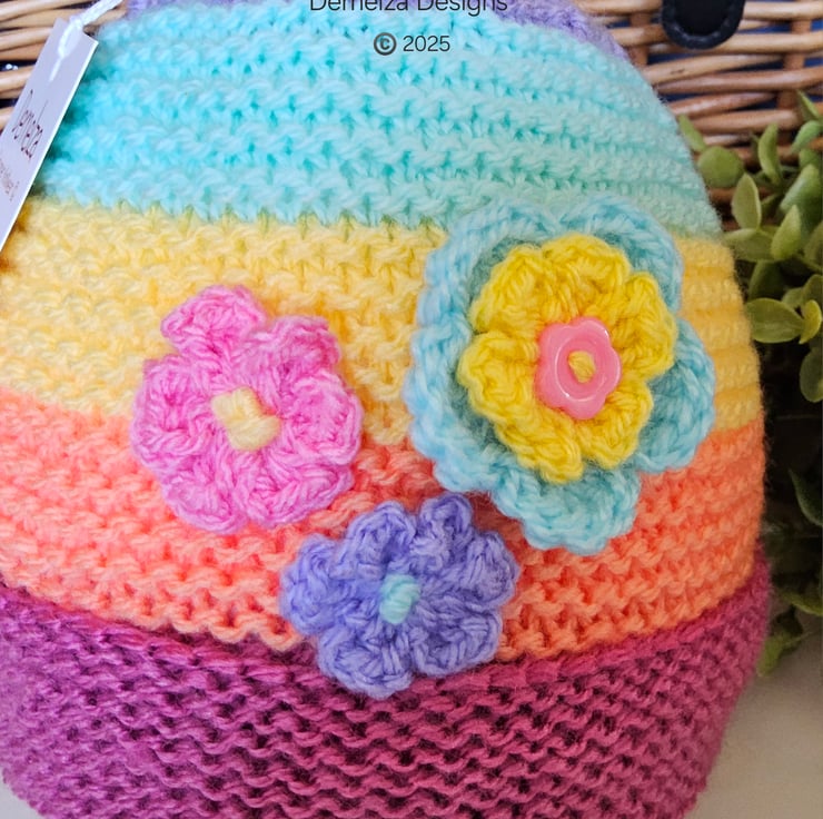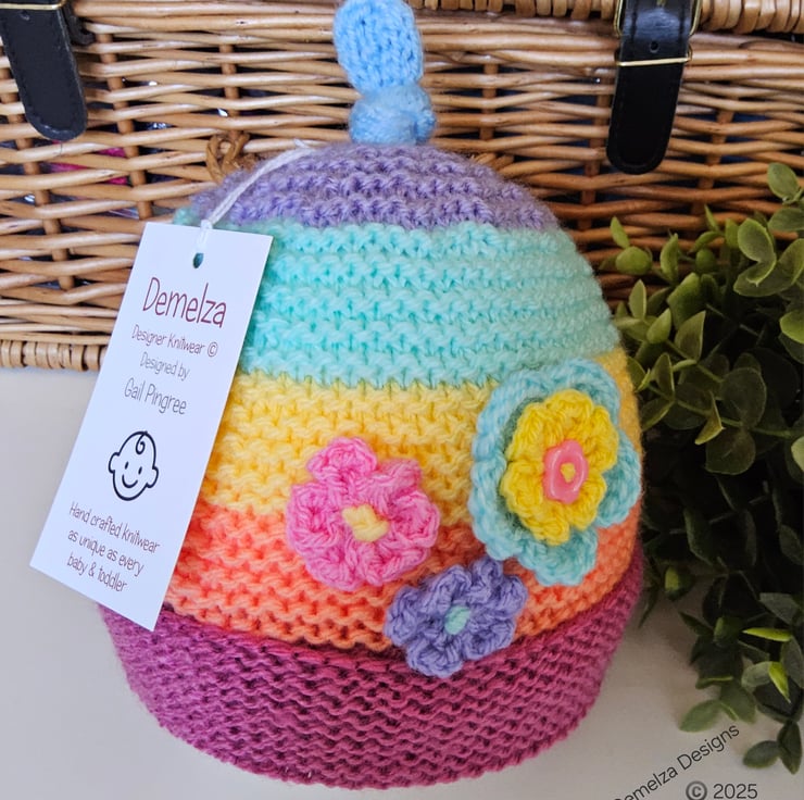 A beautiful eye catching unique toddler girl's hat lovingly designed and totally hand crafted in Cornwall using quality French and British branded premium machine washable yarns.