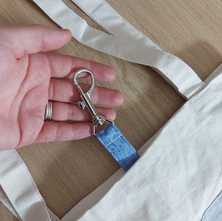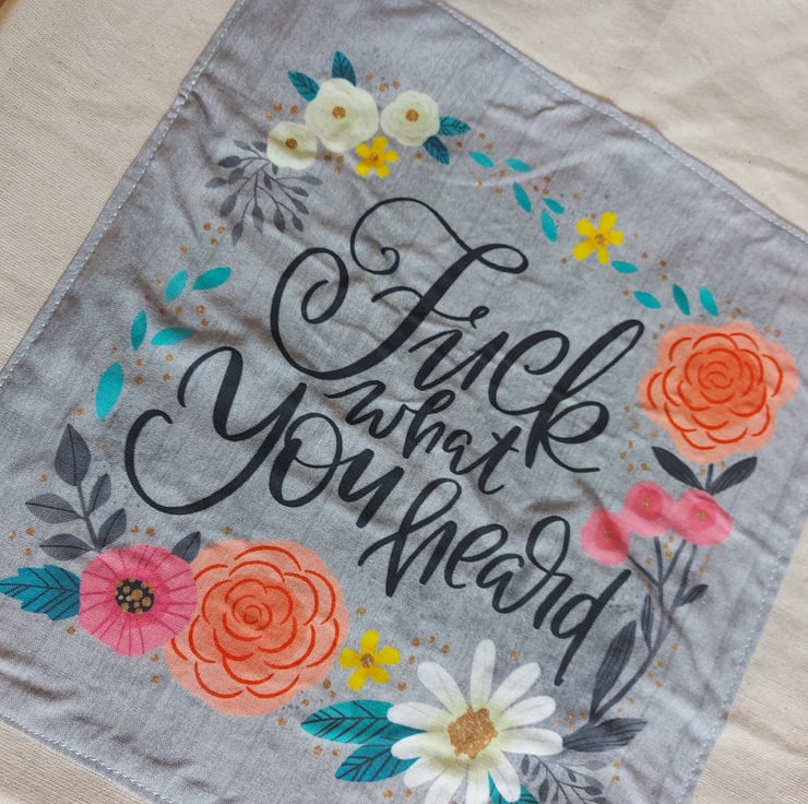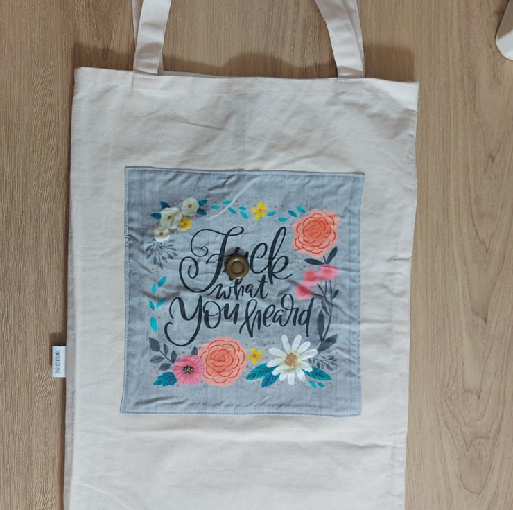 This is a one of a kind calico tote bag with a lovely motivational quote front and centre reading '' f-ck what you heard " srounded by beautifull flowers these totes make brilliant gifts for your friends and family that like a little sass with their sustainable shopping , inside is a coordinating dusty purple mushroom printed key clip so we can avoid those moments when we are rooting around the bottom of our bags hunting for them .