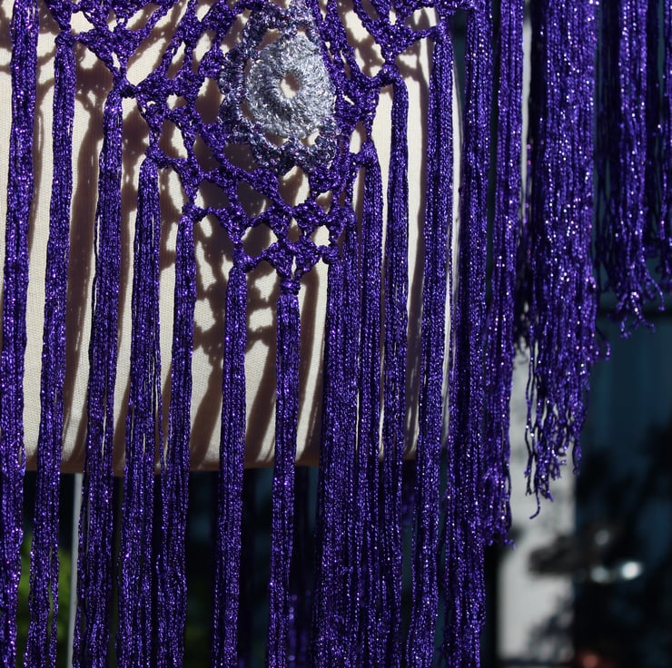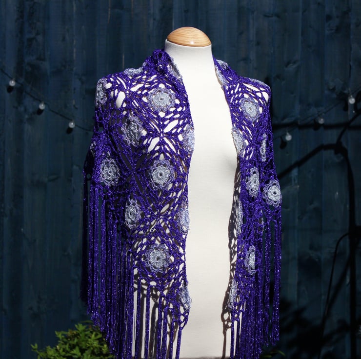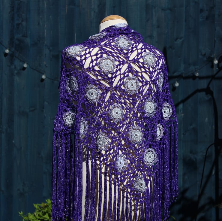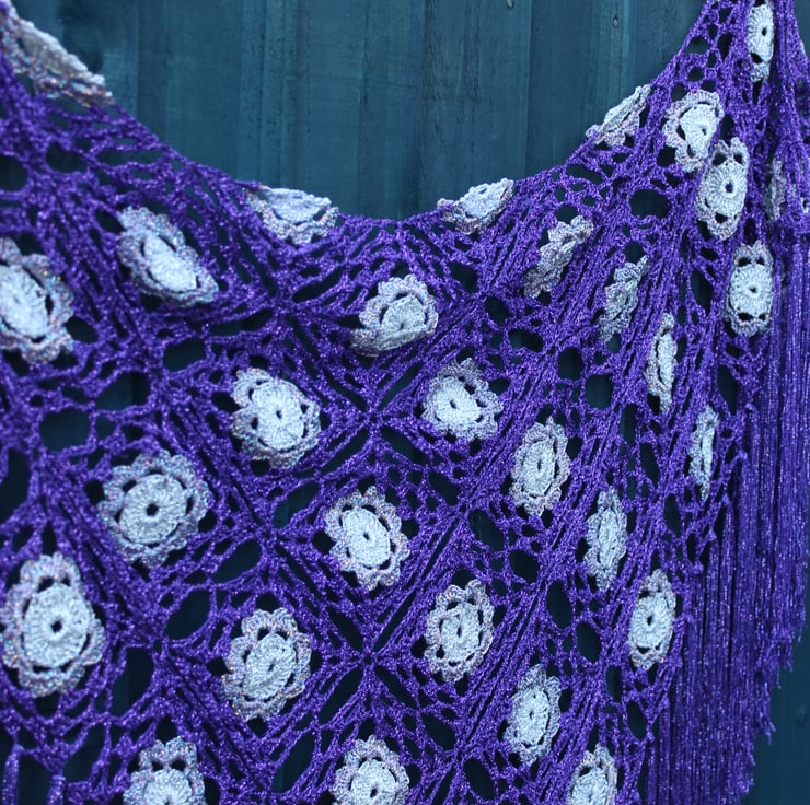 This crocheted fringed triangular shawl is made using genuine vintage Twilley's Goldfingering thread in silver, lilac mix and purple, using one of their patterns published in 1978. The use of these vintage materials not only adds a unique charm to the shawl but also ensures its quality and durability. Designed during the disco era and crafted in recent years — very retro, very sparkly, very swishy fringing. When the sun hits this shawl, it creates a mesmerising display of sparkles!