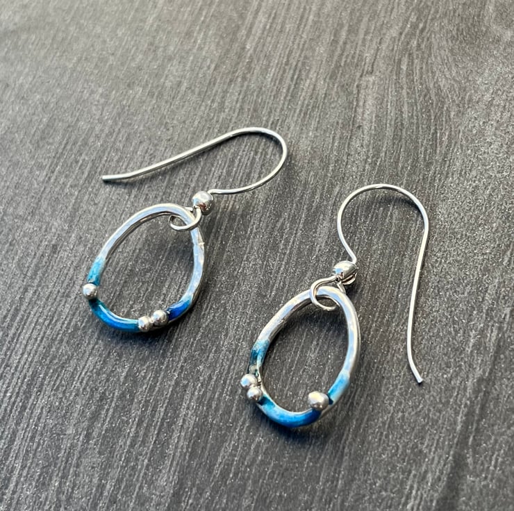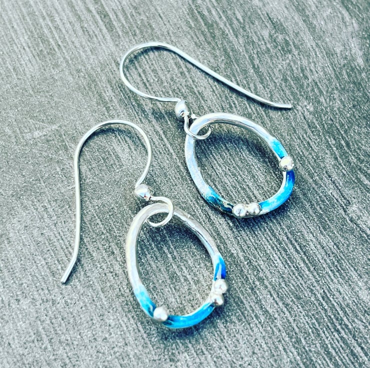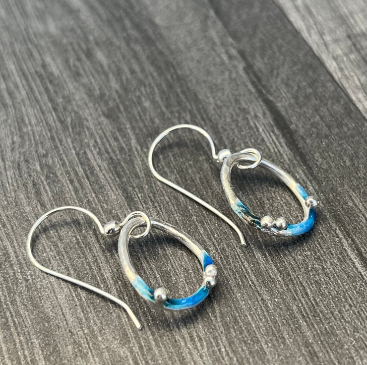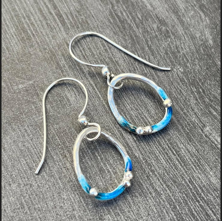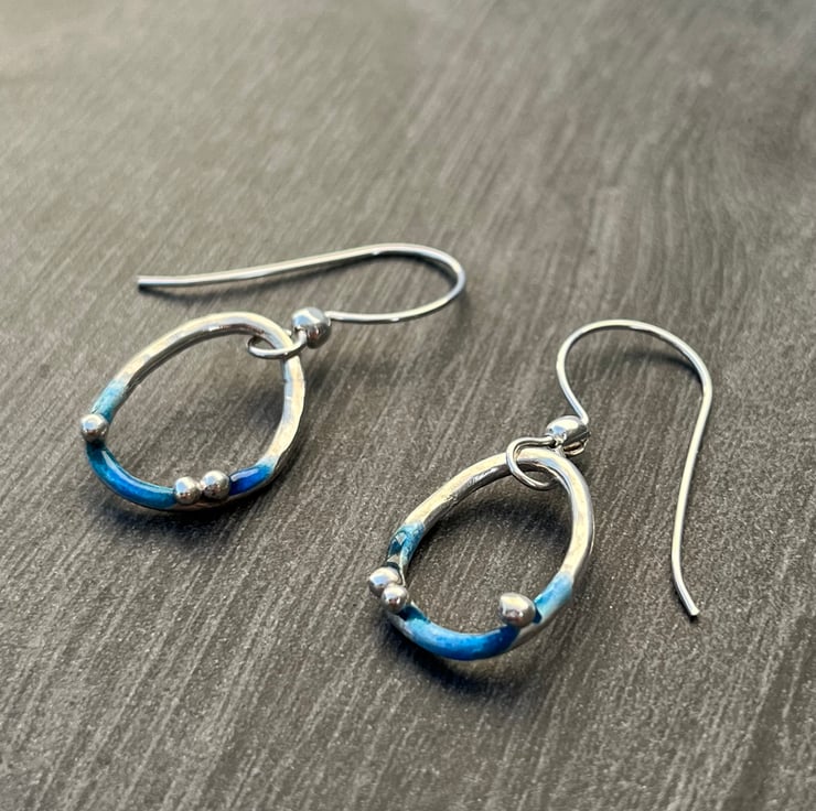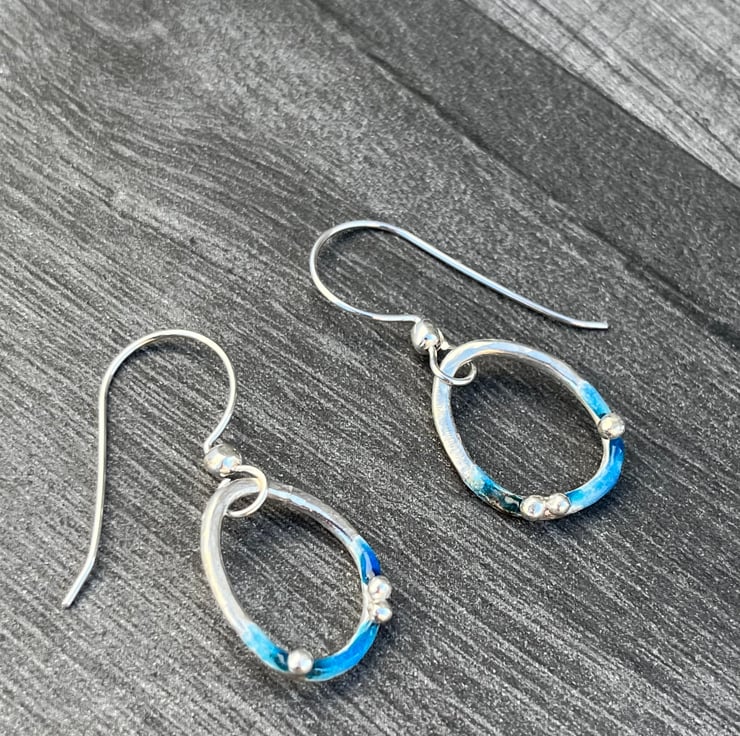 These Enamel Earrings are made from hammered Sterling Silver with Fine Silver Bubbles detail and beautiful, transparent blue enamels. The earring unit are an irregular oval shape and were inspired by pebbles. The pebble unit measures approximately 1.2cm in height and hang on Sterling Silver Ear hooks.