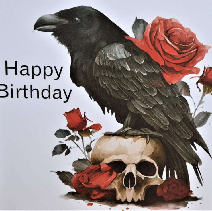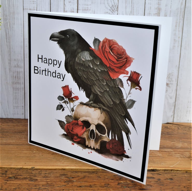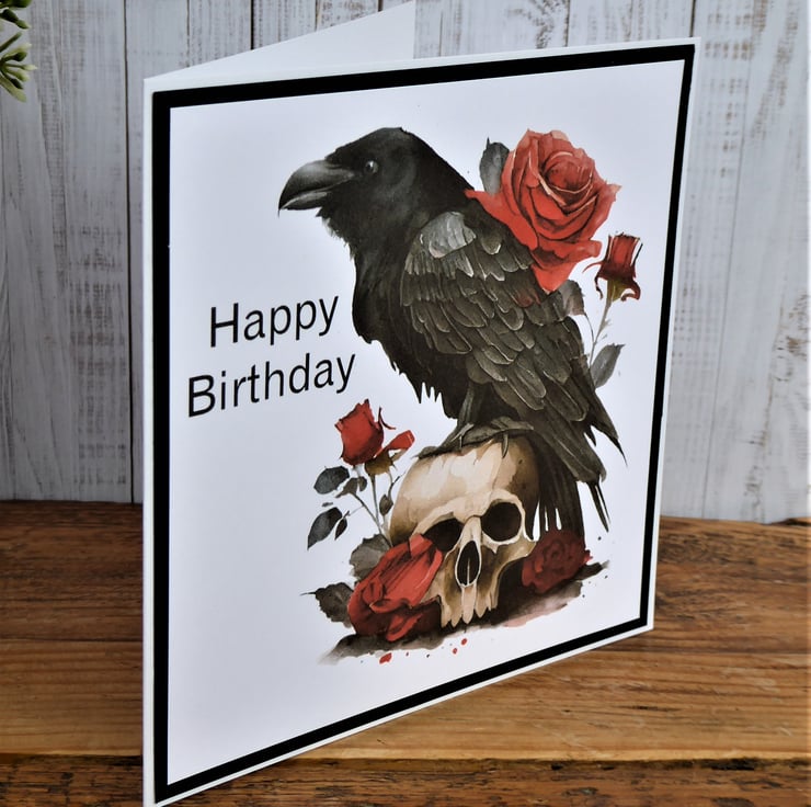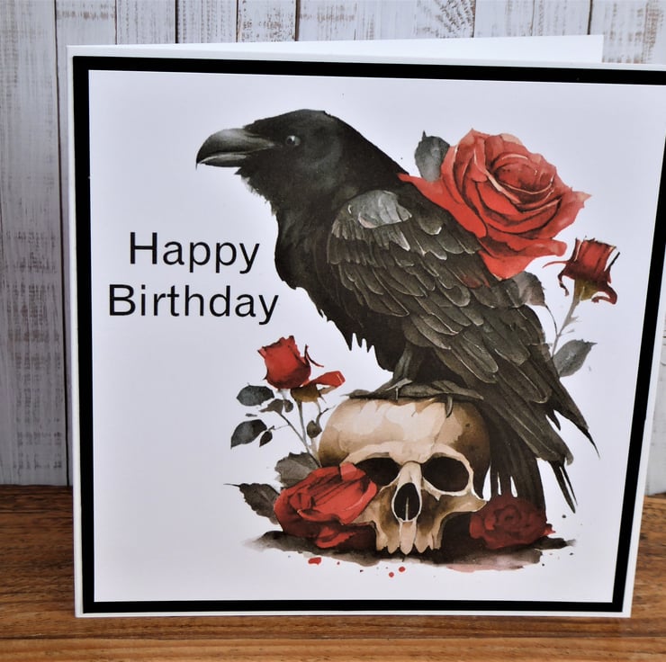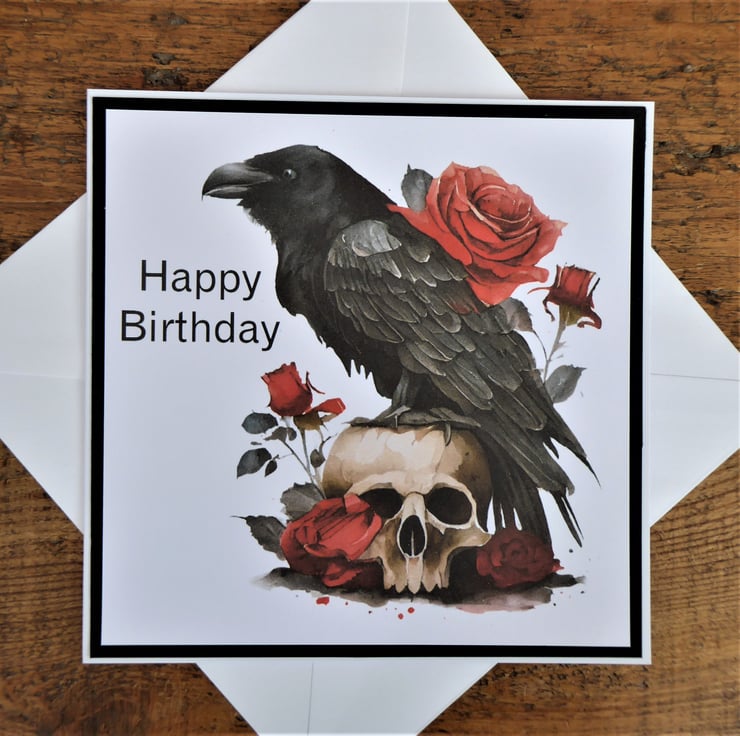 Gothic Raven Birthday Card made from 300gsm white card. Printed image and added sentiment, layered up onto black card before completing.