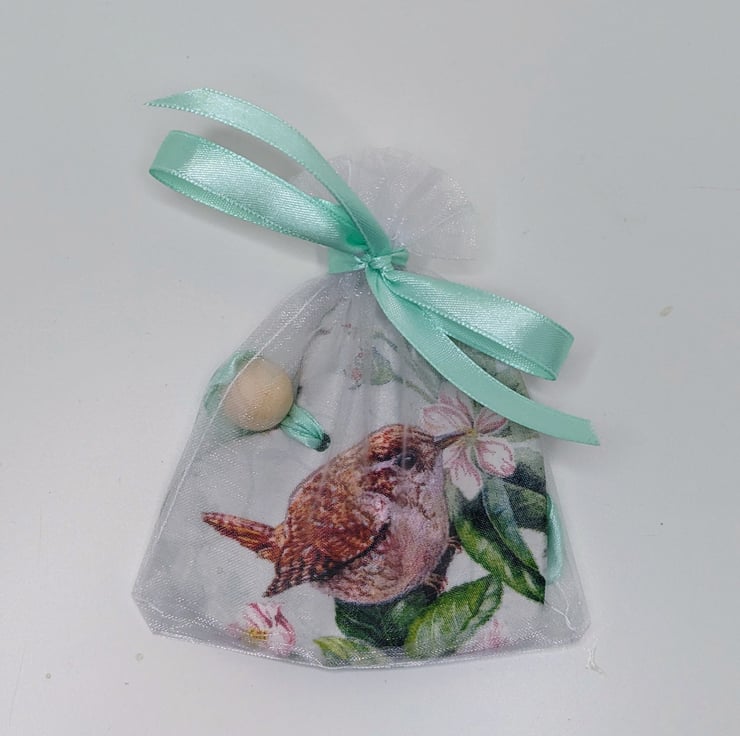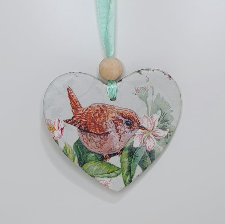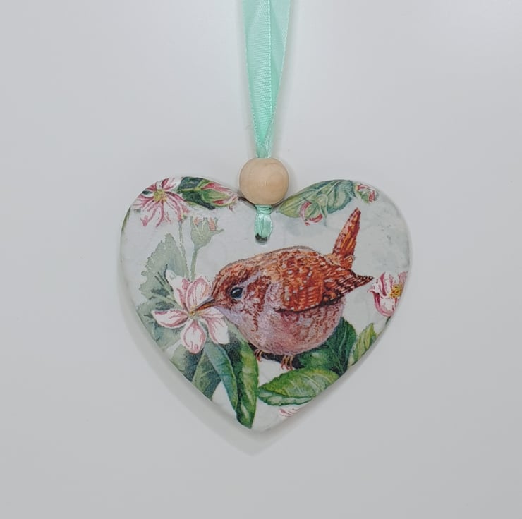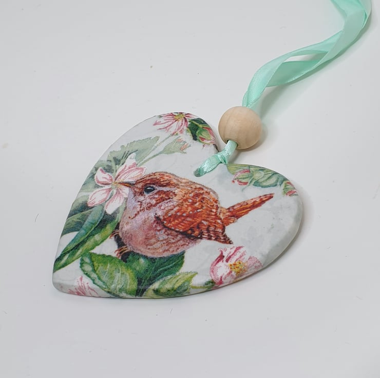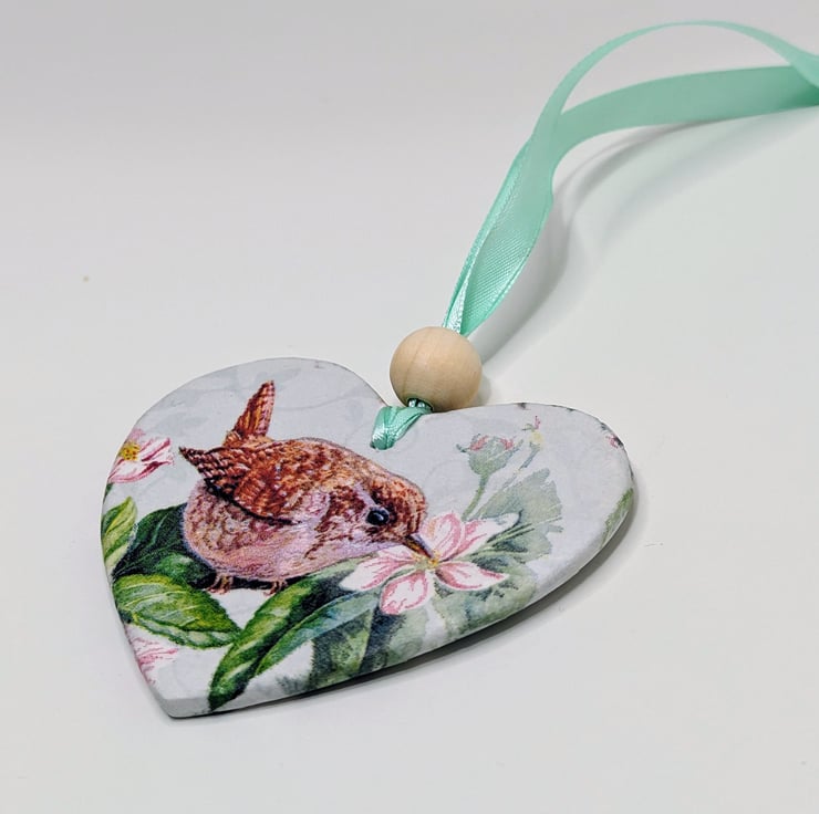 Pretty double-sided wren decoration, perfect for hanging in a window, from a handle or piece of furniture. This lovely clay heart has been lovingly made from air dry clay and the decoupaged with a gorgeous wren design on each side and has been finished with a wooden bead and pale green satin ribbon ready to hang. This lovely hanging decoration would make a lovely gift for a bird lover and comes prettily packaged in an organza bag finished with ribbon.
