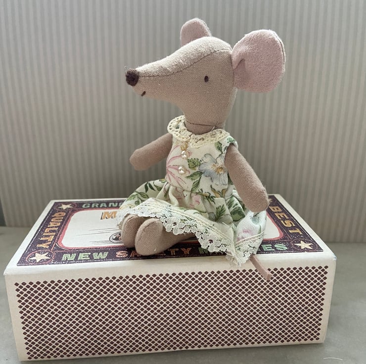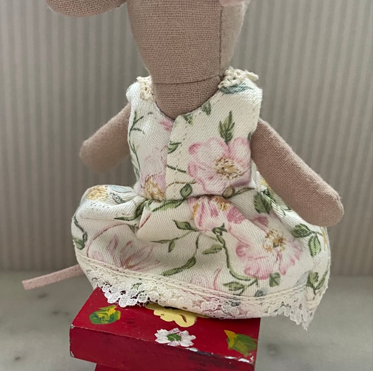 Beautiful handmade maileg mouse vintage party dress . vintage fabric with honeysuckle print and I’ve put a tiny lace collar and little beads on the front . All made from vintage fabrics and trimmed with antique lace trim.