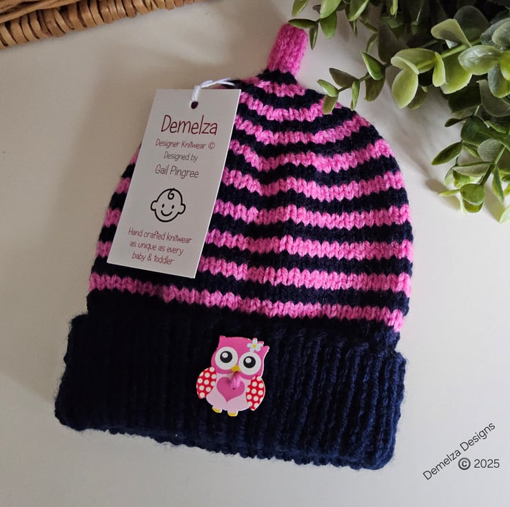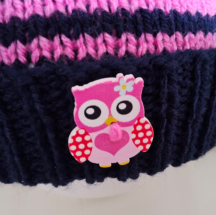 An adorable practical little hat designed and hand knitted in Cornwall using quality French and British premium acrylic yarns. The hat rim has a genuine wooden owl button firmly attached for added decoration to the item.