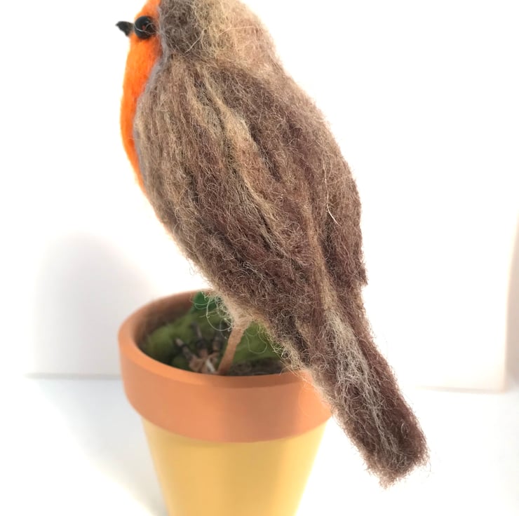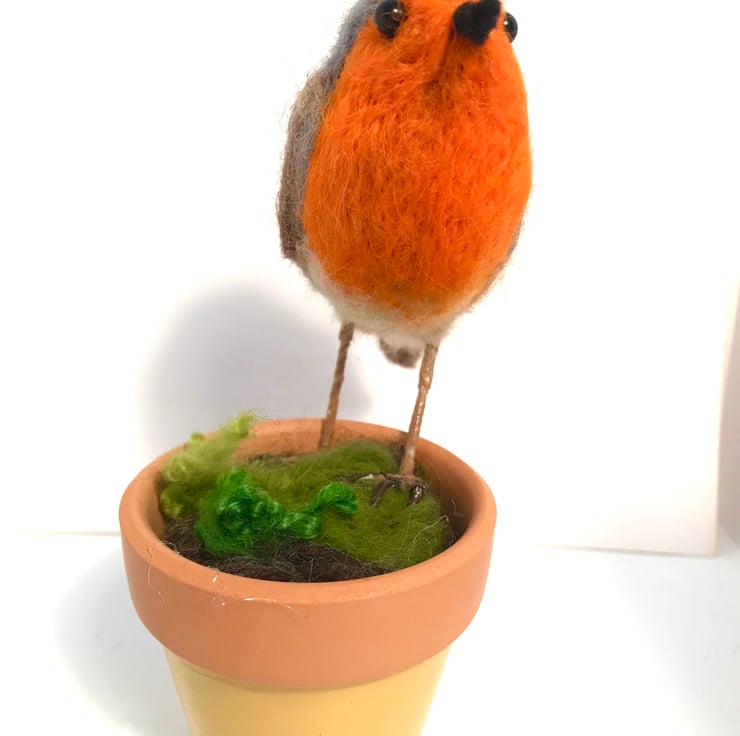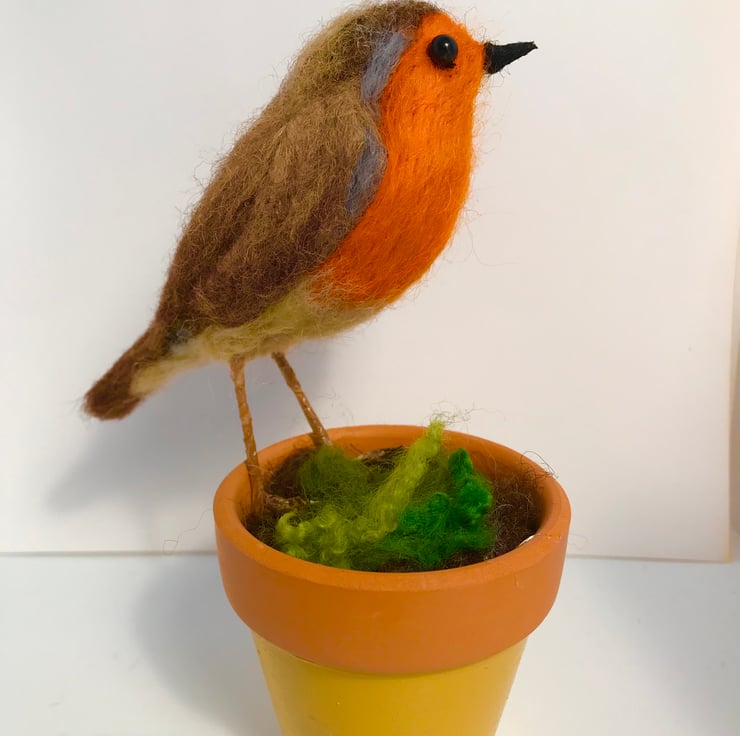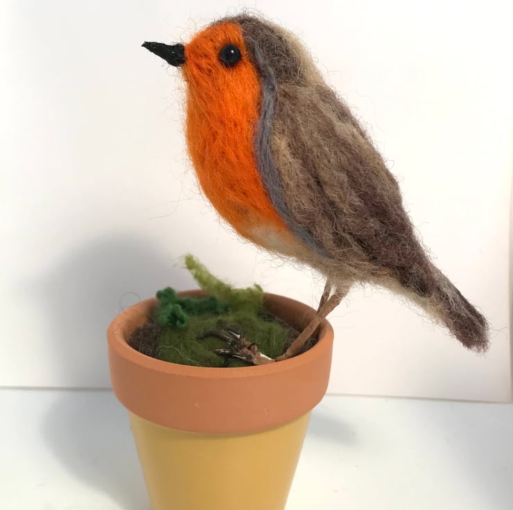 The robin has a wire which forms the beak and goes through into the tail. Bead eyes sewn in , wire legs.