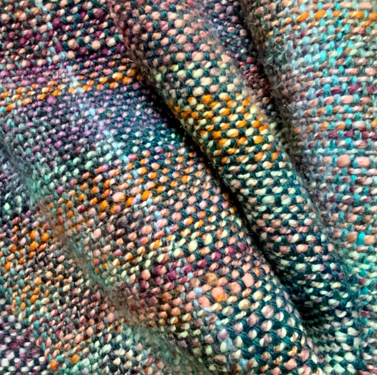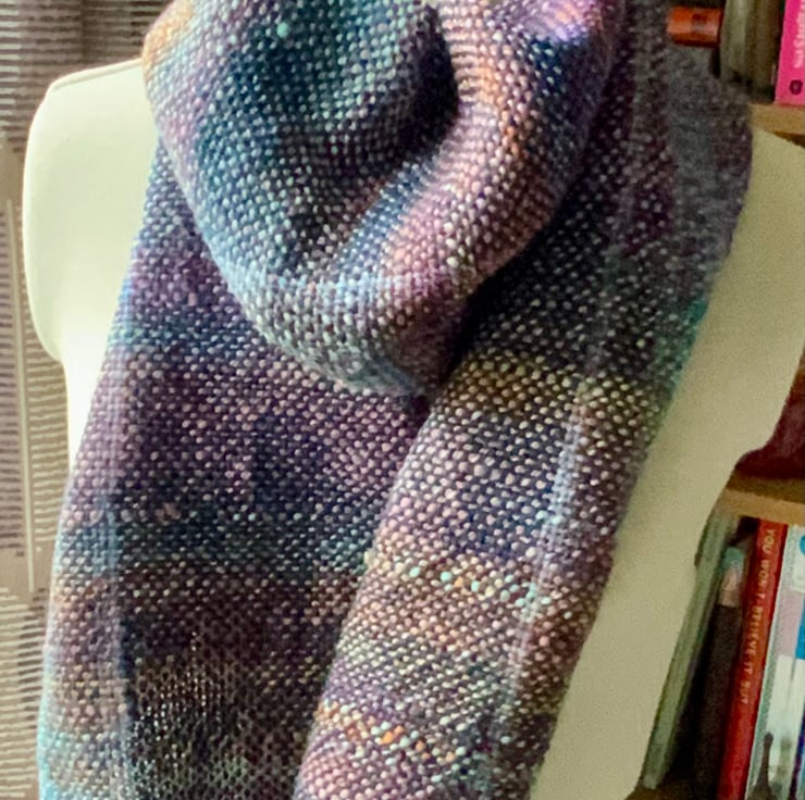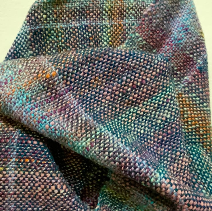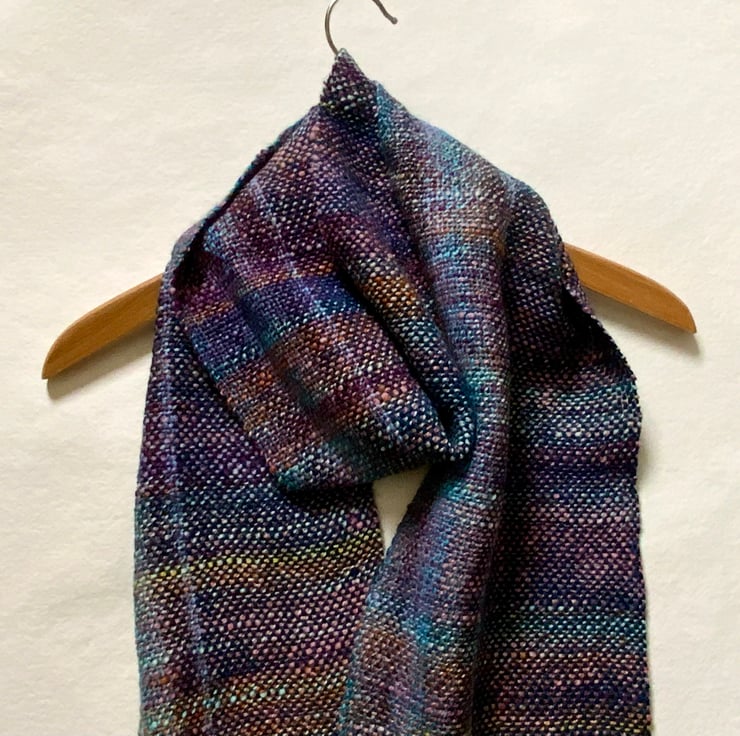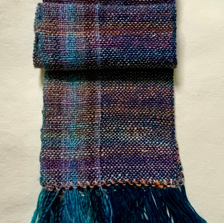 This is a hand woven scarf using yarn I have hand spun in the weft and commercial yarn in the warp. It’s been woven on my rigid heddle loom and is 172cm x 22cm wide plus fringe. It is all pure British wool and is soft to touch. The colours are navy with turquoise, orange, pinks and plum. It’s a very pretty scarf and would go with lots of things, perfect for keeping you warm in the colder weather.