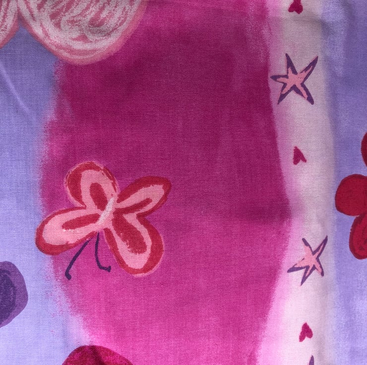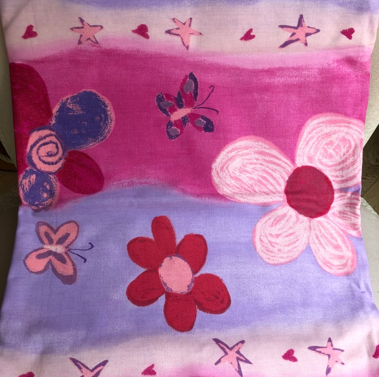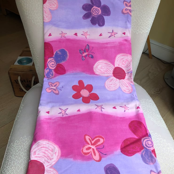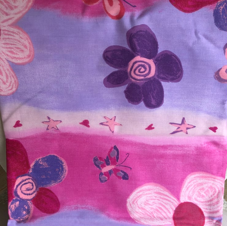 Wonderfully cheerful flowers and butterflies fabric which measures approximately, 145x250cm.