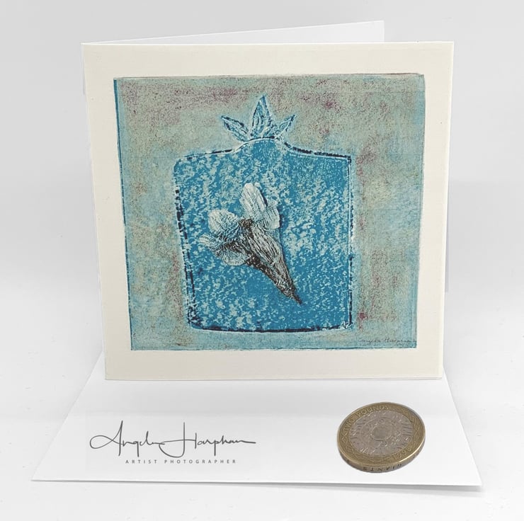 A square art card with one of my own digitally enhanced images from an original linocut. Blank inside for your own message, it has my image and logo on the back.