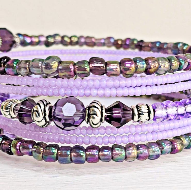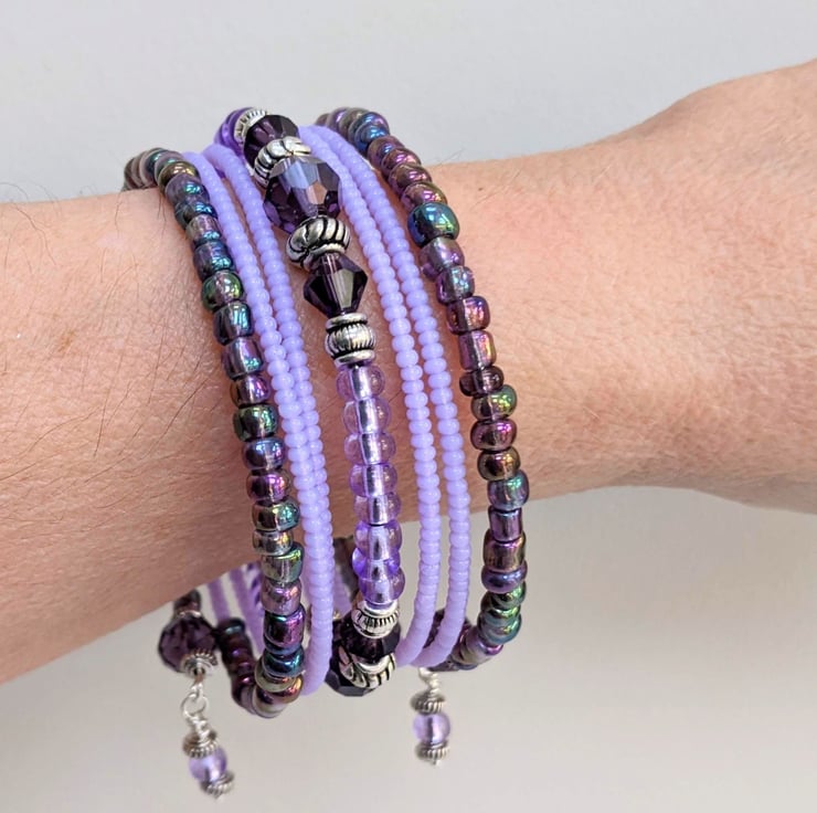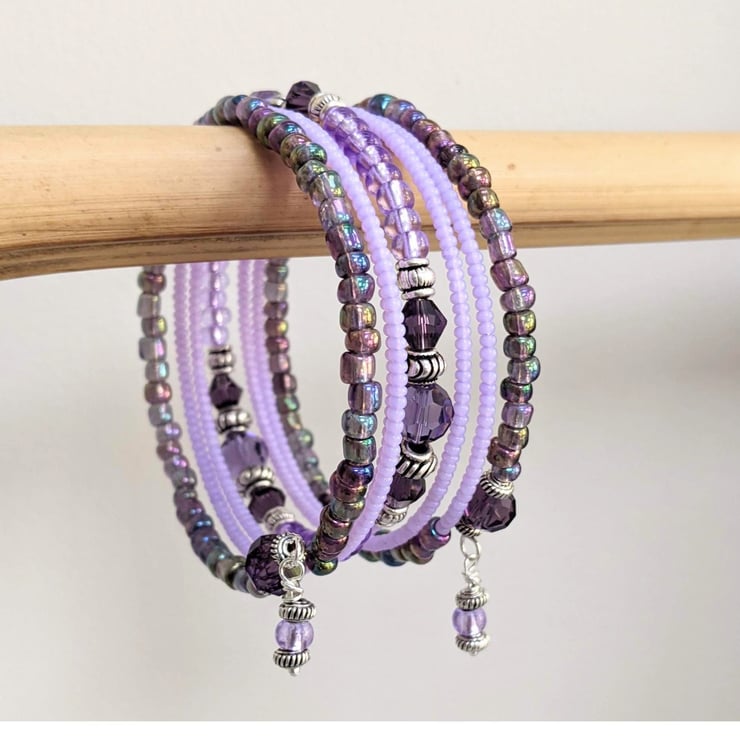 Purple and silver coloured memory wire bracelet. At either end there is a handmade charm. Lovely bracelet to brighten up your wardrobe or to give as a gift.