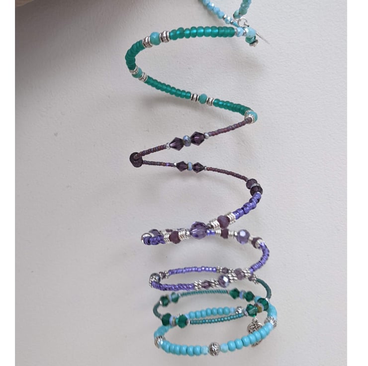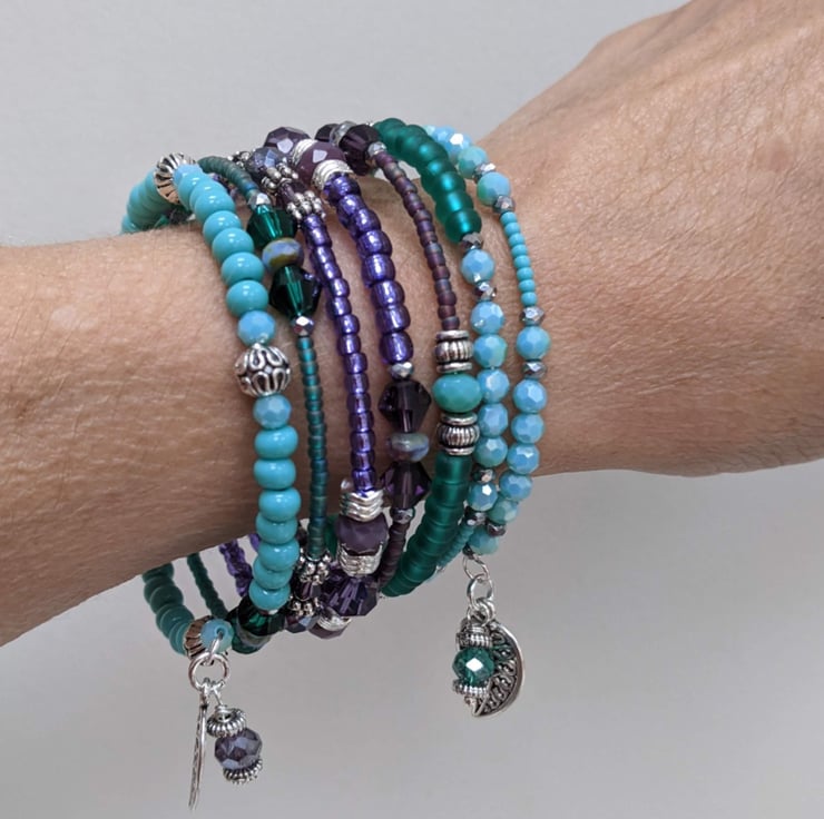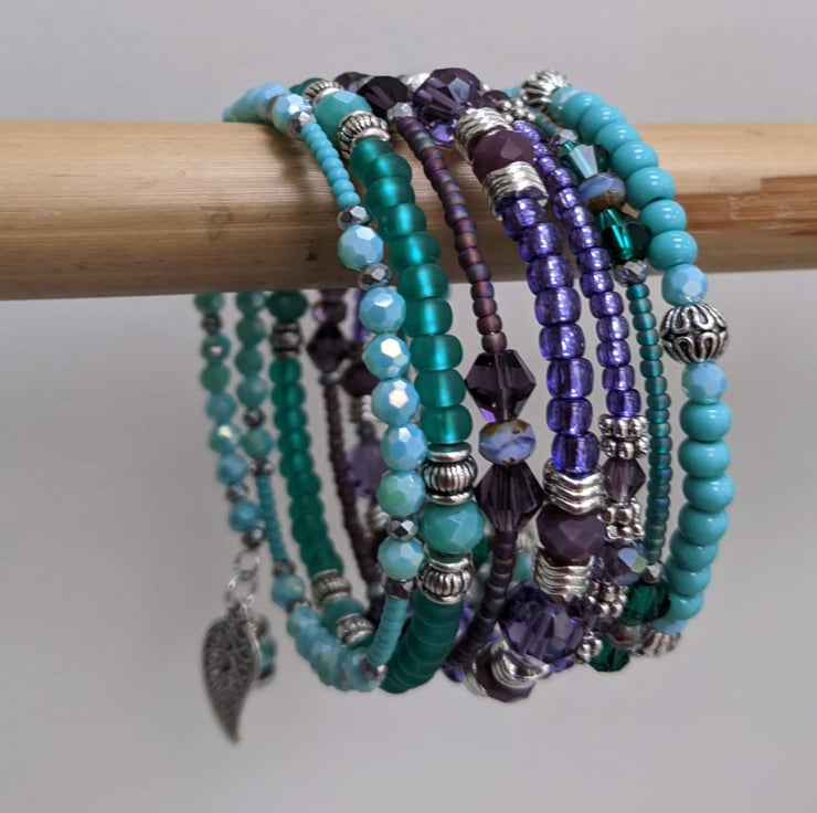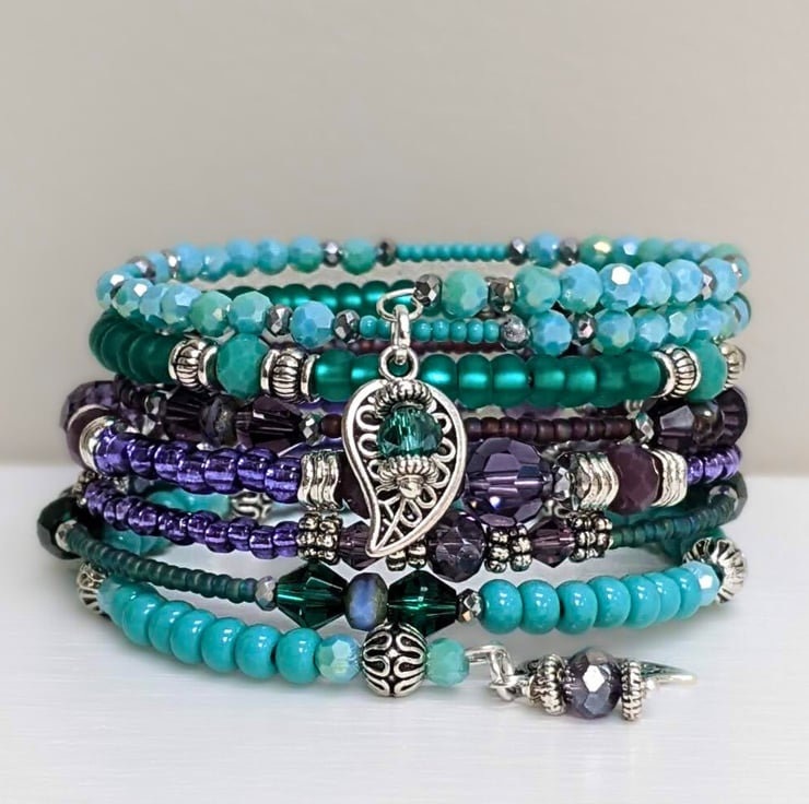 Add a touch of Boho charm with this seed bead memory wire bracelet in turquoise, purple and silver with little silver tone leaf charms and wire wrapped crystal glass dangles at both ends. This bracelet gives the appearance of individual bangles but with the convenience of being all one piece which simply wraps around your wrist forming a stacked cuff. No fussy catches to cope with. There is no fear of it dropping off your wrist either! Makes a lovely gift for loved ones and friends or to treat yourself with. A great everyday bracelet suitable for casual or formal wardrobe.