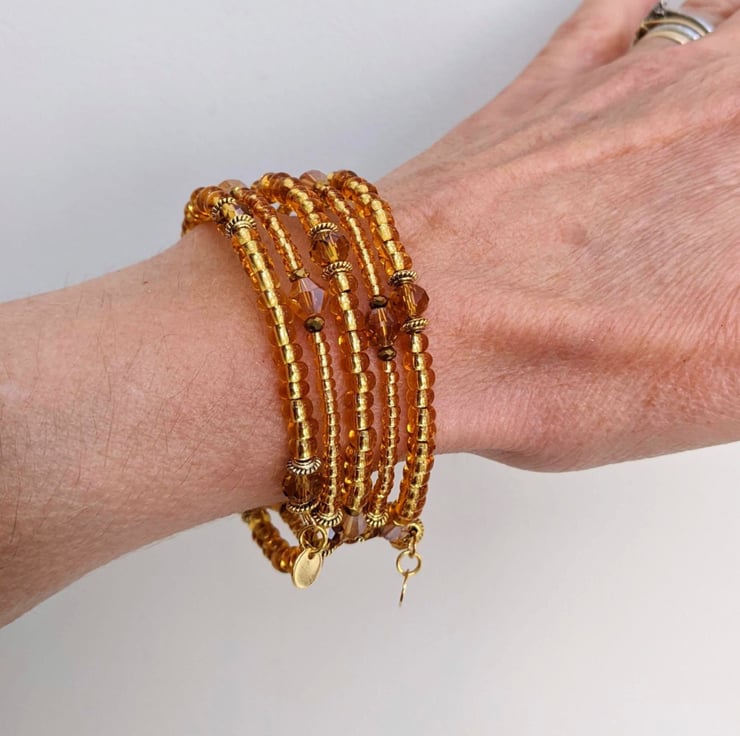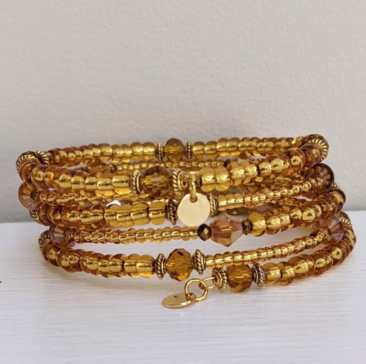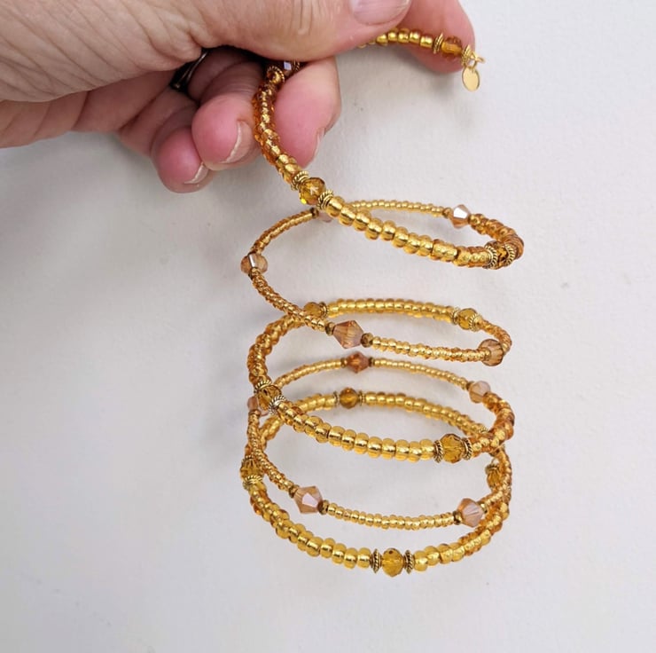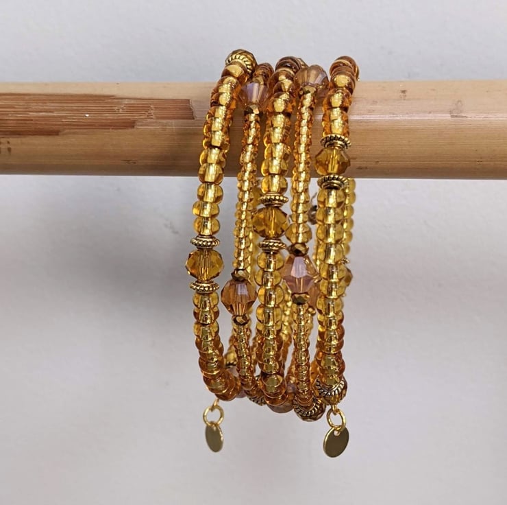 This lovely gold coloured memory wire bracelet with its little sparkly beads which glint in the light will brighten up your wardrobe with a little boho charm.