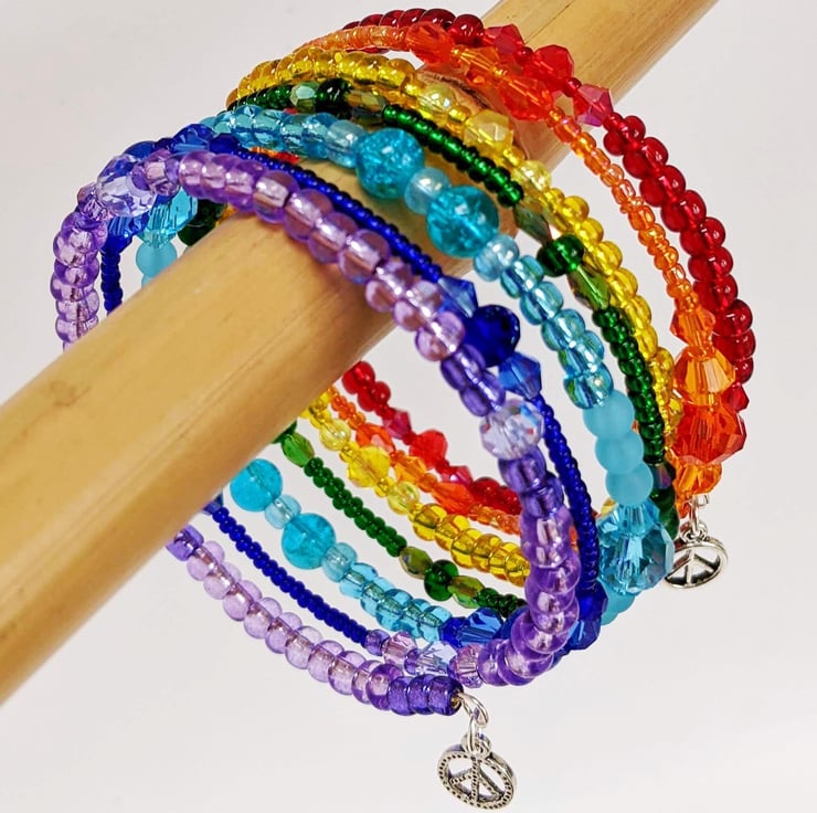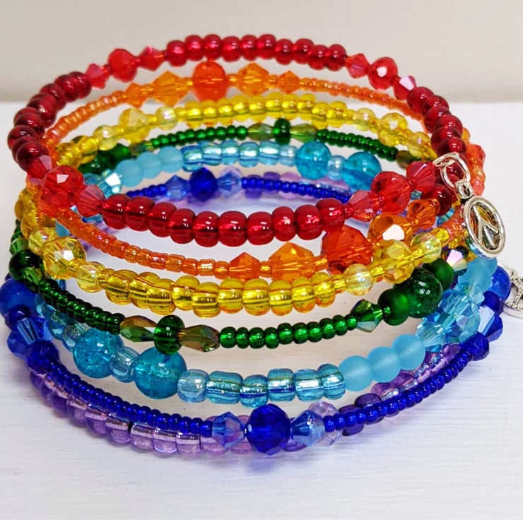 This colourful wrap seed bead bracelet made up with multicoloured glas beads and arranged into the colours of the rainbow, is ideal for celebrating Gay Pride, LGBT, Peace, or just simply to brighten up any wardrobe!