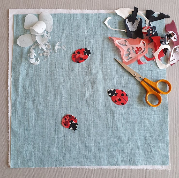 Original fabric appliqué and machine embroidered designs which have been scanned, and then printed onto recycled card.