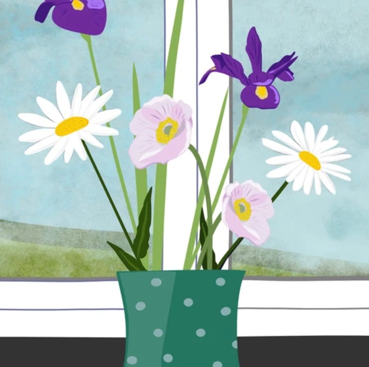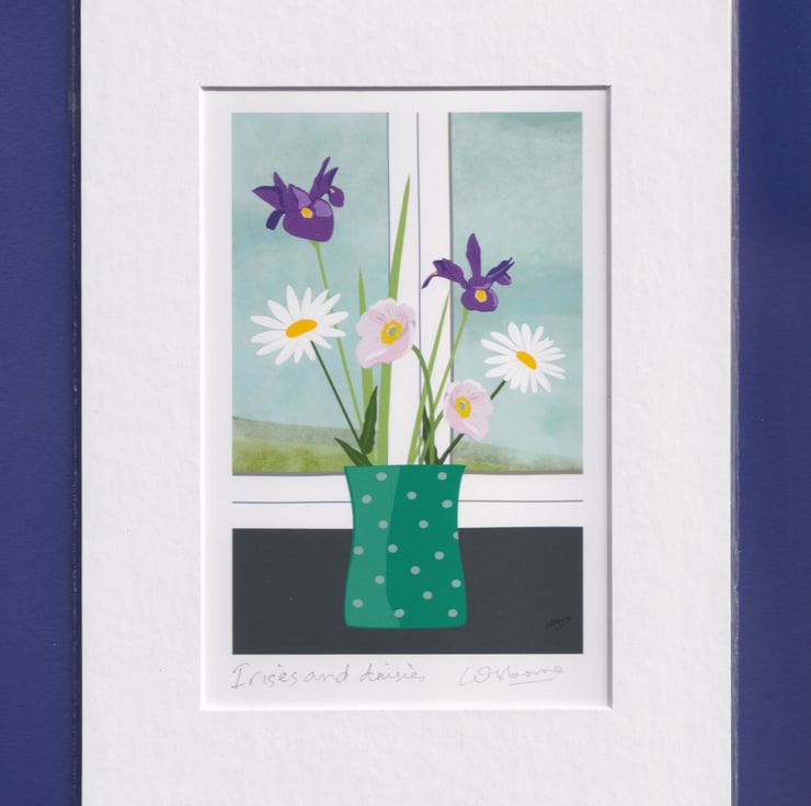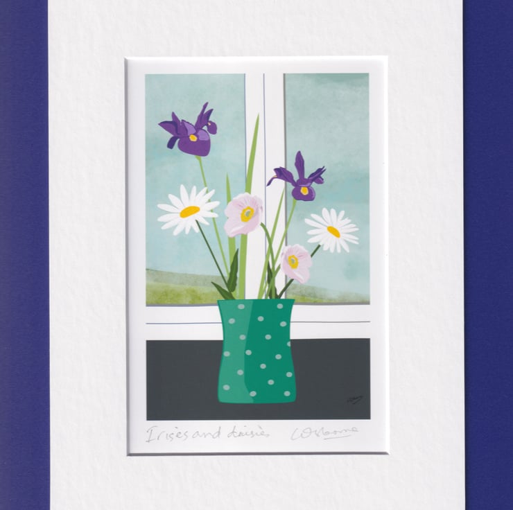 Irises and daisies - high quality open edition print, with mount, from one of my illustrations. This illustration features purple irises, daisies and anemones in a vase on a windowsill.