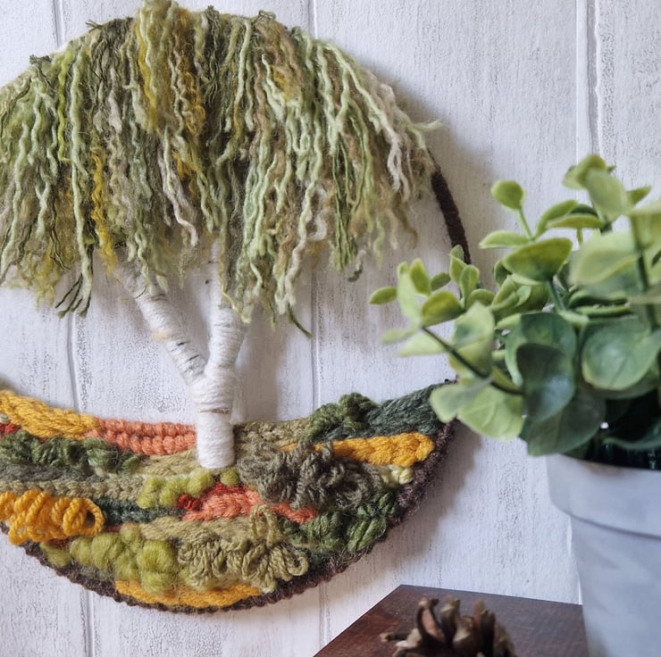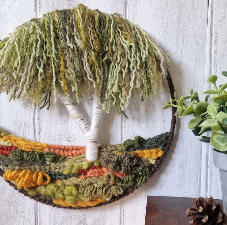 Immerse your space in the captivating beauty of autumn with this 20cm handwoven tapestry. Its enchanting autumnal tones harmonize perfectly with the lush green backdrop. The textured hoop base complements the graceful canopy of the silver birch tree, creating a seamless and visually appealing composition.