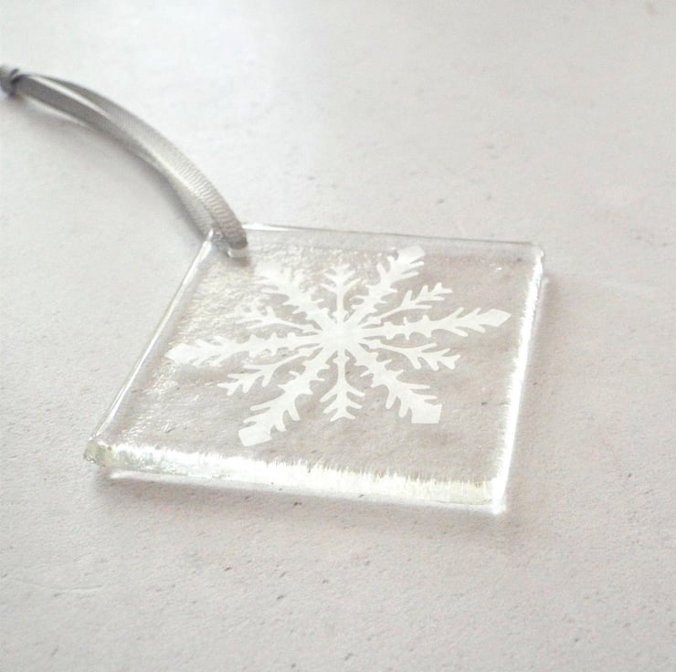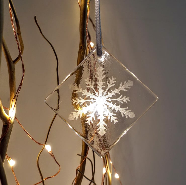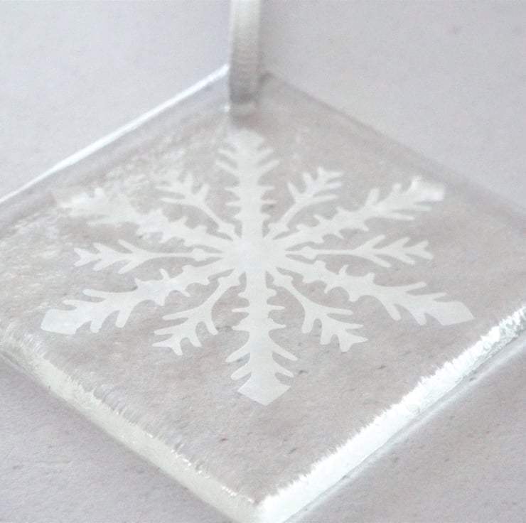 The process...First the glass is fused in the kiln to round off 'soften' the edges from it's natural state. After a 14 hour fuse the unique design stencil (created by myself) is applied and the glass sandblasted (this effect will not wash or wear away over time). Any area of the glass not being sandblasted at the time is temporarily covered. After the stencil is removed the hole is then drilled and finally the ribbon added. There are two other styles of snowflakes and one star in my other listings.