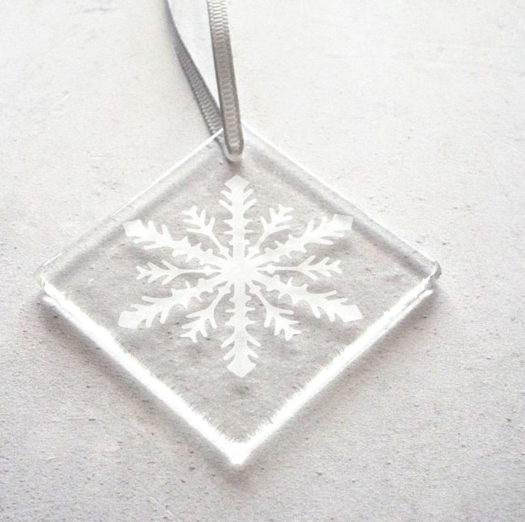 This clear fused glass, white Snowflake Hanger is perfect to hang in the window or put up on your Christmas tree. It measures approx 5cm x 5cm without the ribbon.
