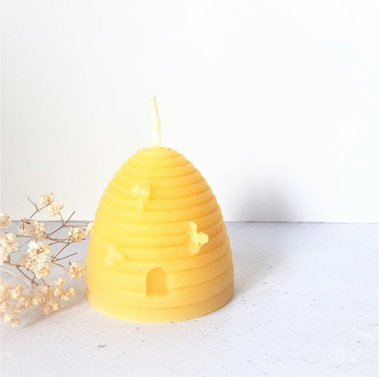 Approx dimensions... Skep (beehive) 4.5cm x 5cm, 'wave' 6.5 cm (d) x 7.5cm (h) and 'honeycomb bee' 10 cm (h) x 4 cm (d). They come presented in a white gift box nestled in tissue and shredded paper. These candles are 100% pure beeswax, no colourings and naturally scented.