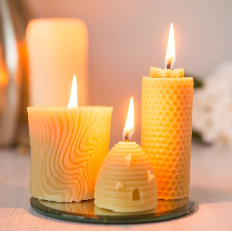 A gift set of 3 pure Beeswax Candles 1 x skep, 1 x 'wave' and 1 x 'honeycomb bee'