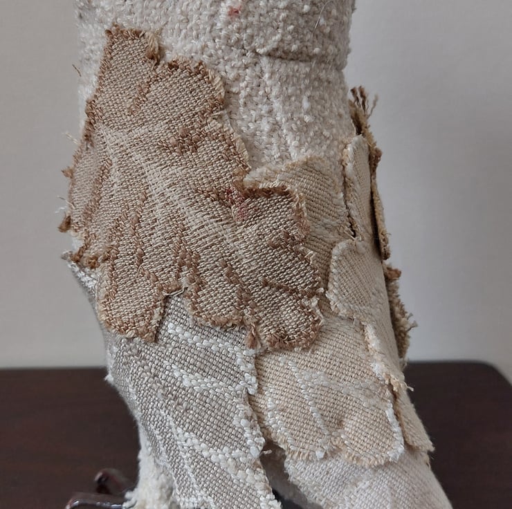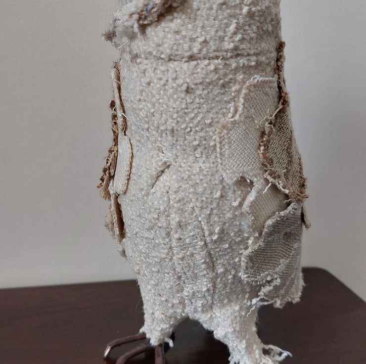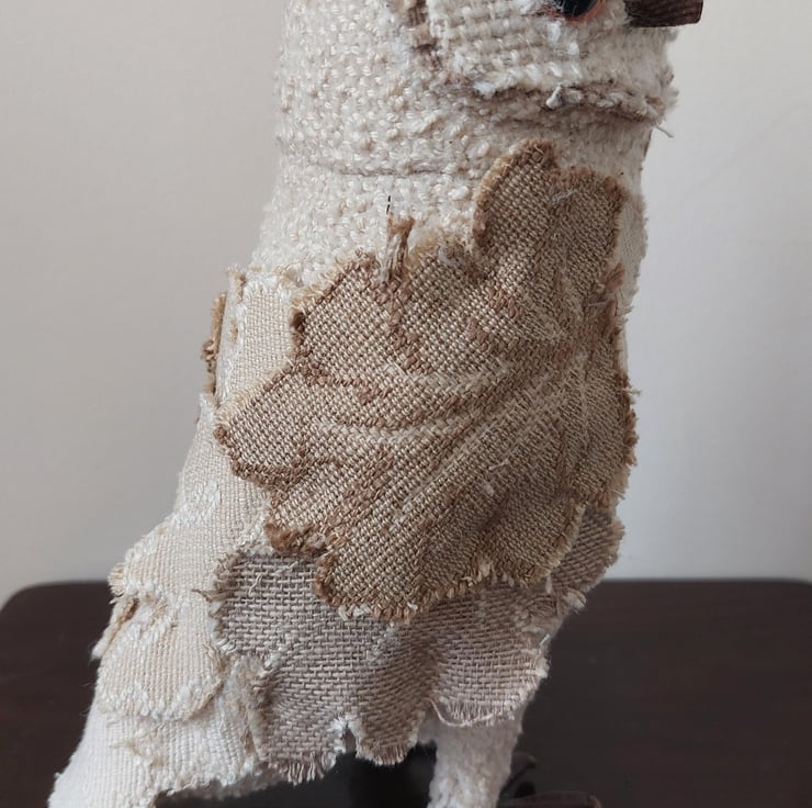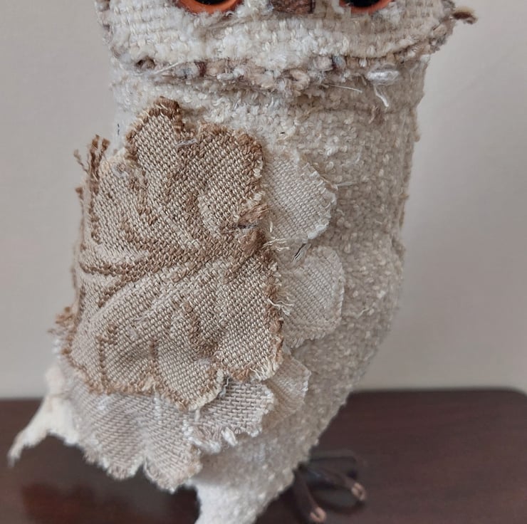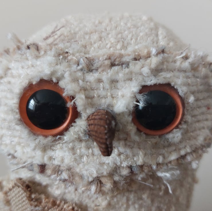 This is Acorn. She's been made using textiles from a fabric sample book that's been rescued from landfill. Freestanding textile owl sculpture. Approx 19cm in height. Please note that this us not a toy.