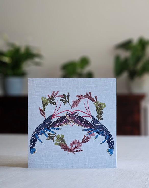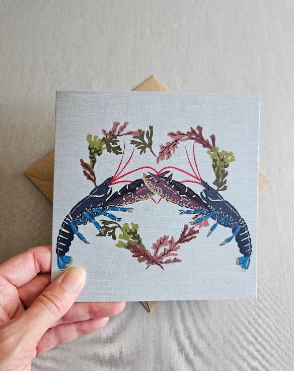 Printed 'Common Lobsters & Seaweed heart' greetings card - original fabric appliqué and machine embroidered designs which have been scanned, and then printed onto recycled card.