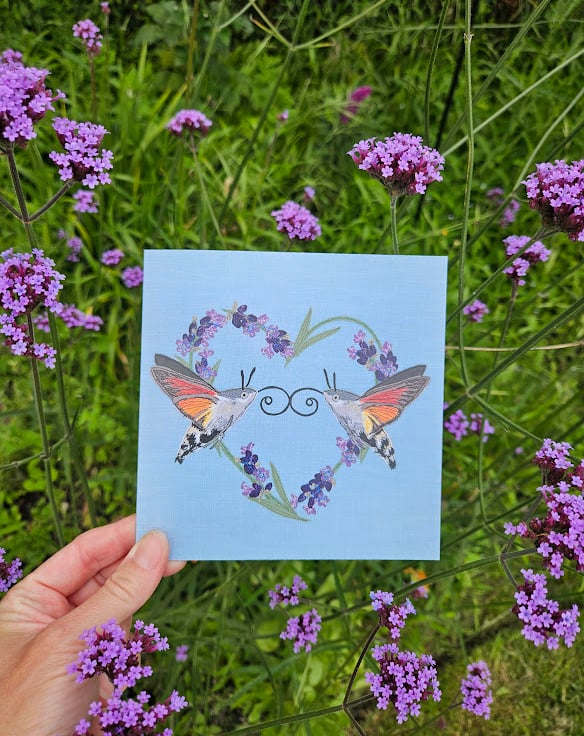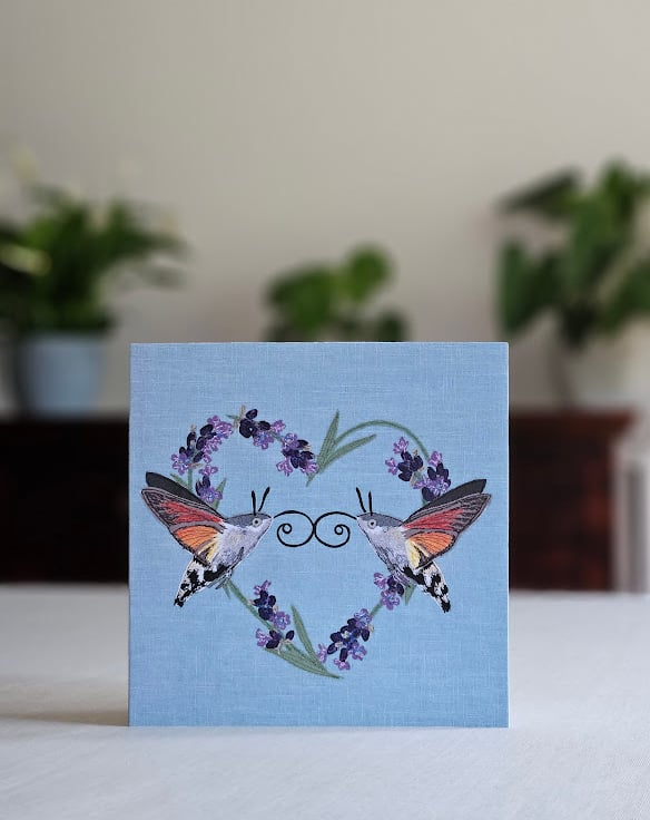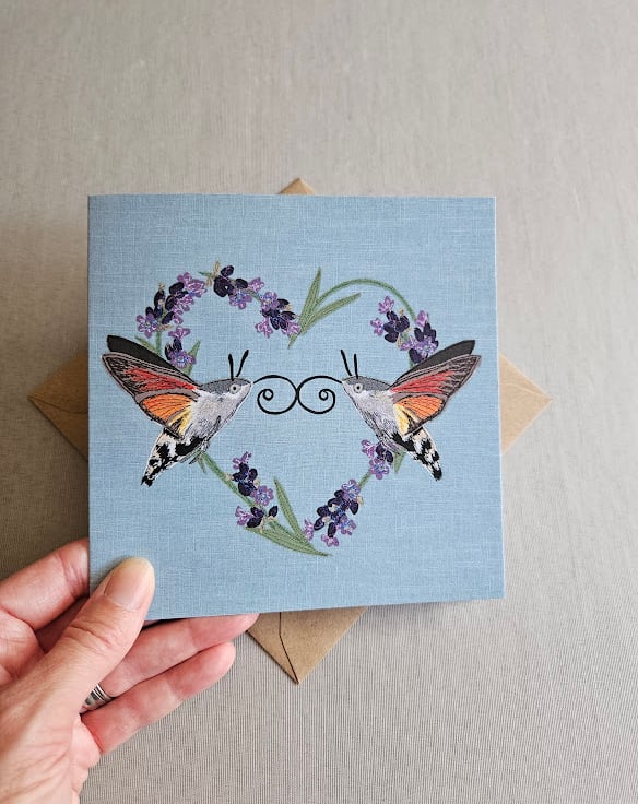 Printed 'Hummingbird hawk-moths & Lavender heart' greetings card - original fabric appliqué and machine embroidered designs which have been scanned, and then printed onto recycled card.