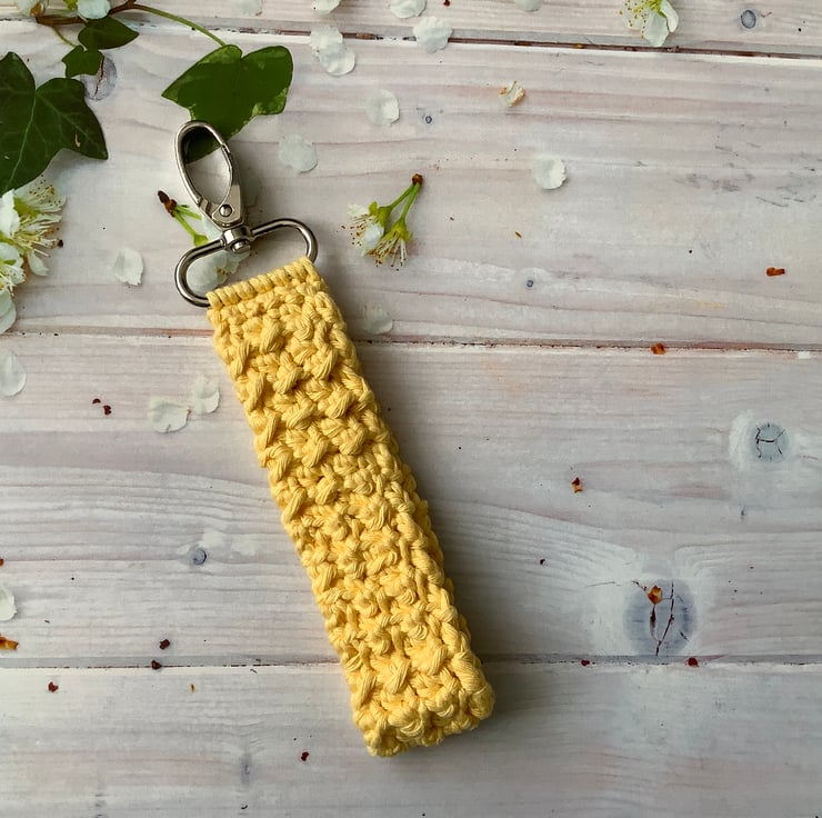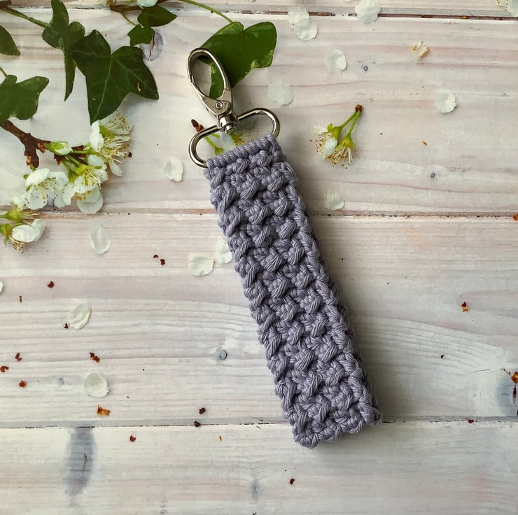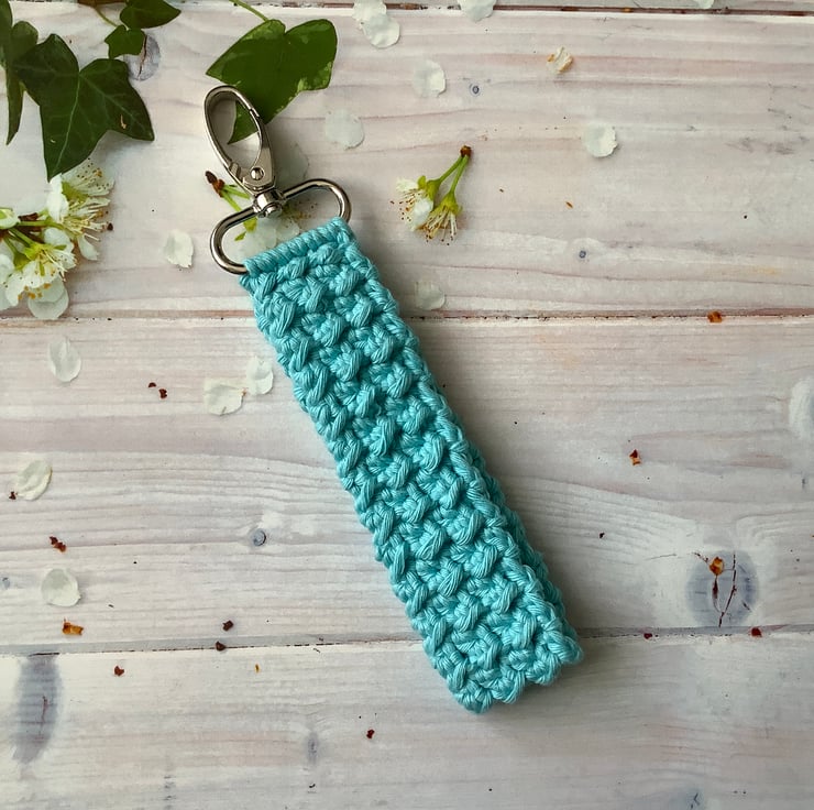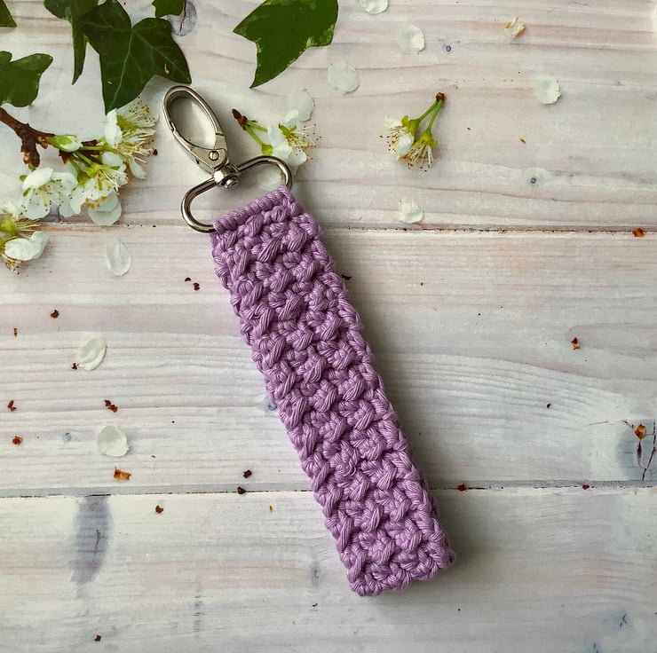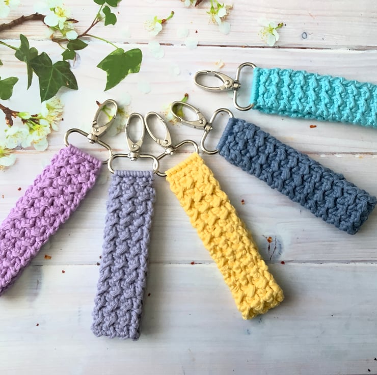 I have crocheted these wristlet keychains keyrings using a firm 100% cotton yarn directly onto a lobster claw style keychain keyring. They are very easy to move from place to place.