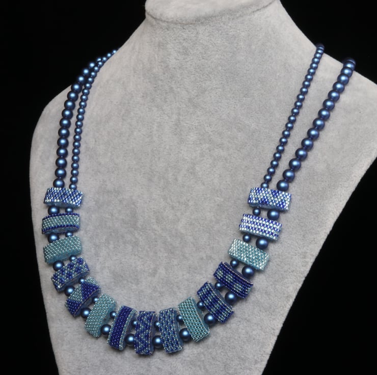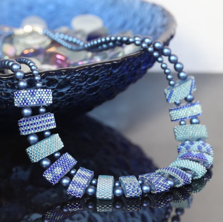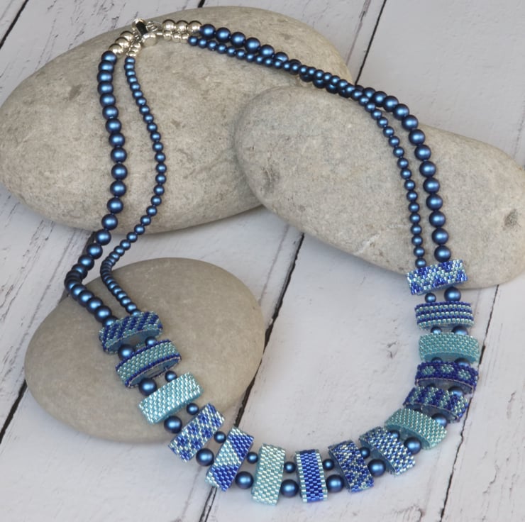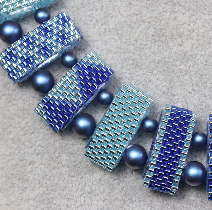 This magnificent beaded necklace is the perfect special occasion piece in glowing shades of cobalt blue and aquamarine, embellished with iridescent dark blue Swarovski beads. It is made from 15 beaded carrier beads, each covered with a loop of peyote beading in patterns made with silver-lined sapphire and aquamarine Miyuki delica beads. The piece is finished with silver beads and a silver plated slide lock clasp.