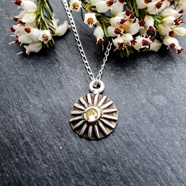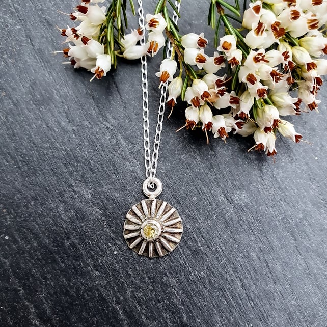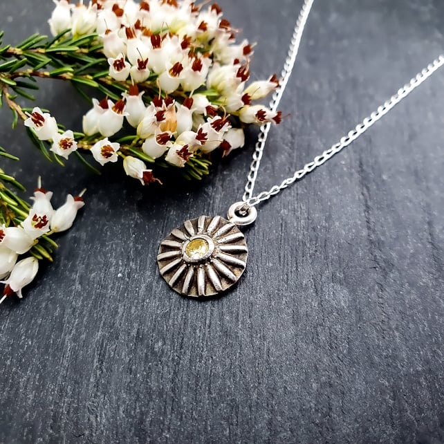 This sweet little daisy pendant has been handmade using silver clay, before setting a sparkling 3mm citrine cubic zirconia in the centre and firing it to create a solid fine silver pendant. I then oxidised it using liver of suphur to create a dark patina on the surface and polished the high points back to a beautiful shine, creating a lovely contrast that highlights the shape of the daisy.