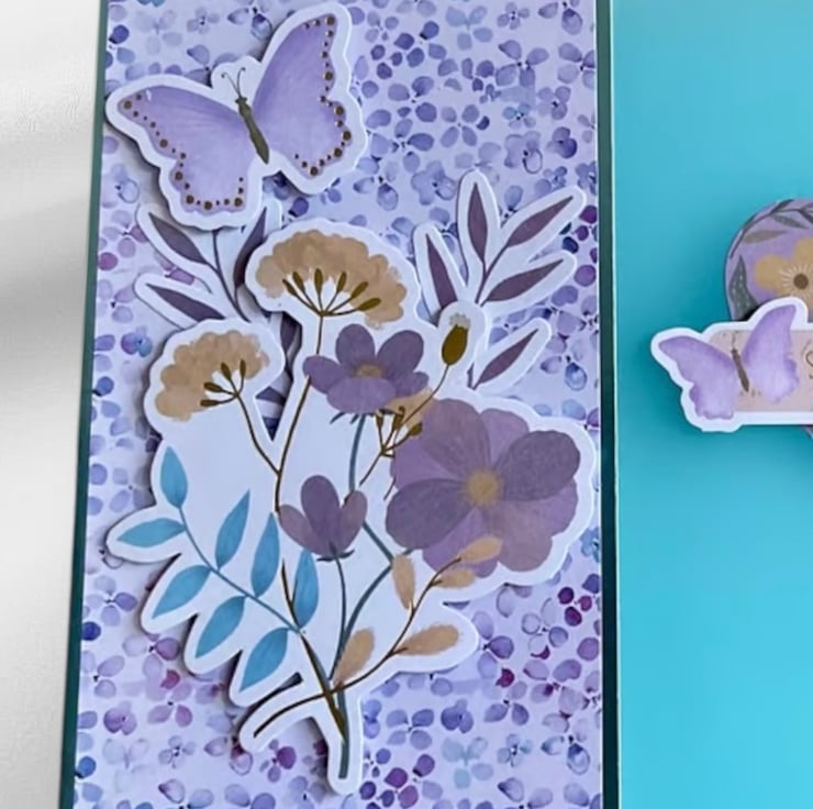 This lovely card has been made by layering blue mirrored card with a floral patterned paper in shades of purple and blue. Die cut floral toppers in subtle shades of purples, blues and gold have been added is 3D.