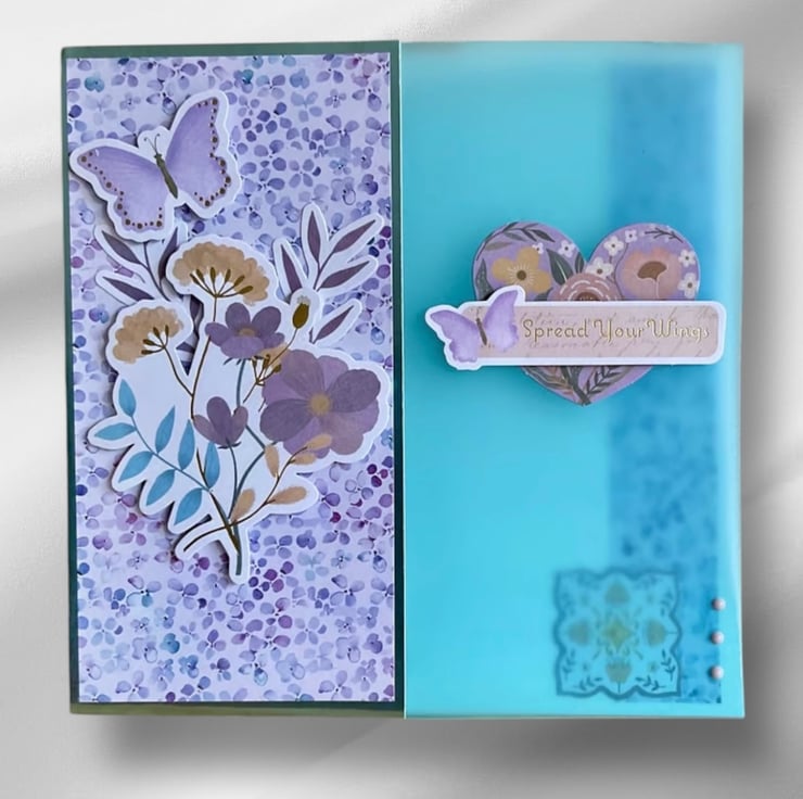 An acetate panel has been added to the right side of the card which has a coordinating heart shaped floral topper with the wording Spread Your Wings. Blue enamel dots have been added for added interest.