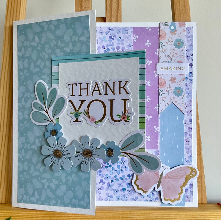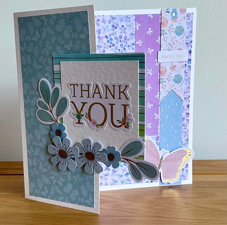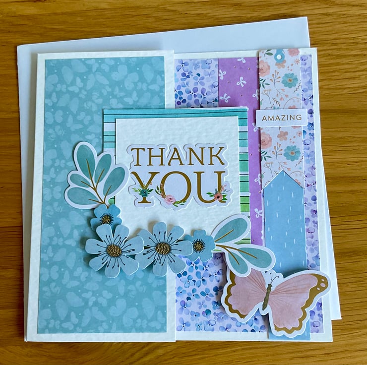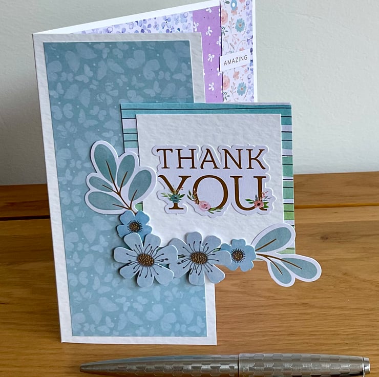 Layers of coordinating paper in shades of purple, blue and green have been added to a hammered white card. The card has been shaped and a topper featuring the words Thank You and die cut flowers and leaves has been added.