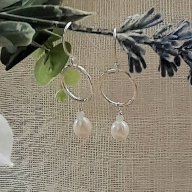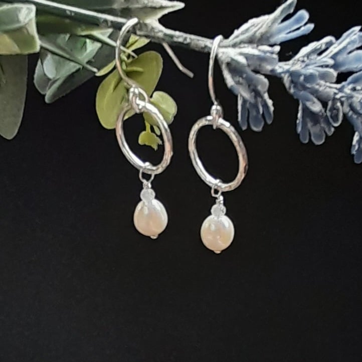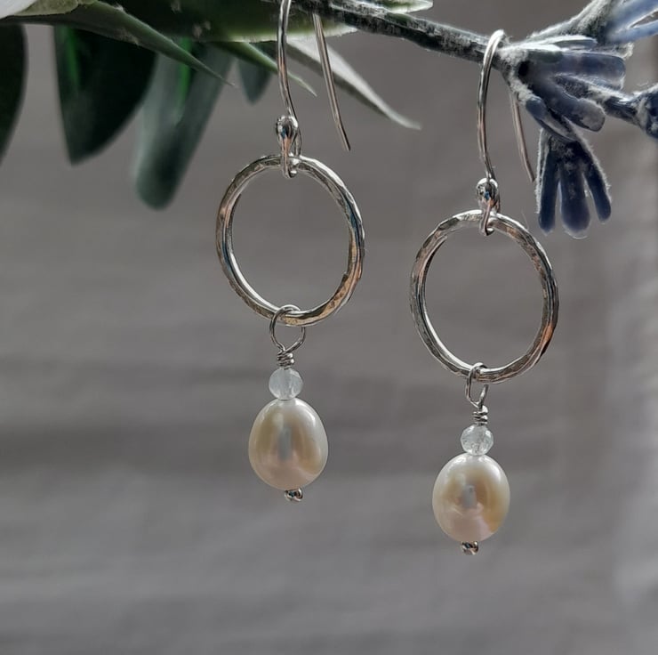 These hoop earrings have been made out of argentium silver wire which has been formed into a round shape with having a freshwater pearl and small faceted very pale blue aquamarine semi precious gemstone attached .