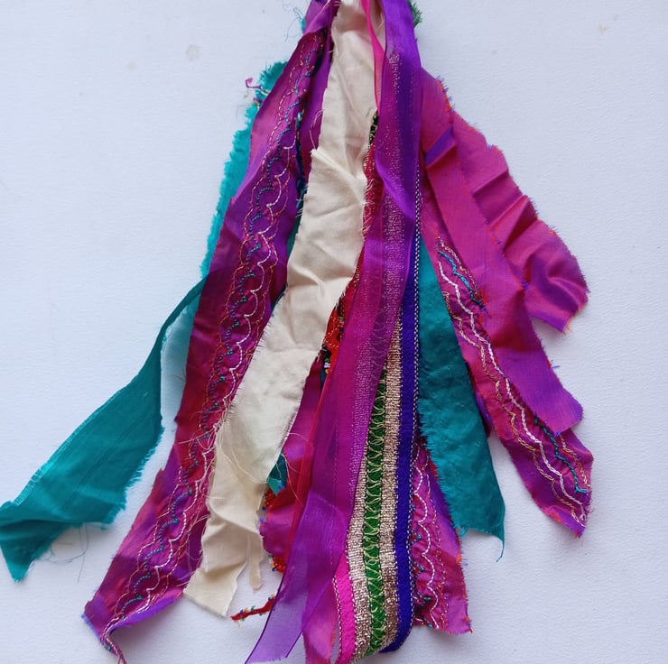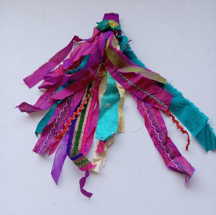 The tassel is a mix of ribbon, trims, sari scraps and fabric.