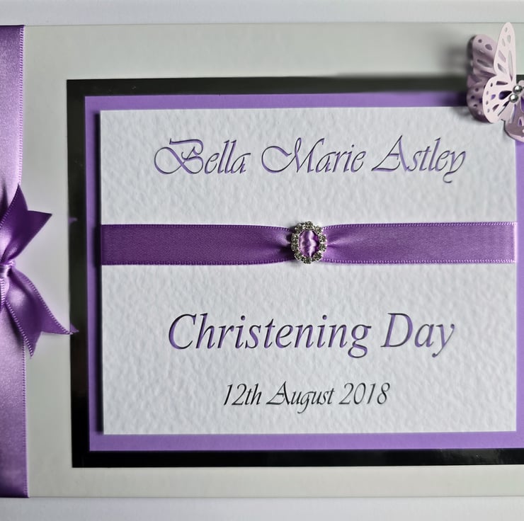 This Christening Guest Book is decorated with embellishments and a ribbon.