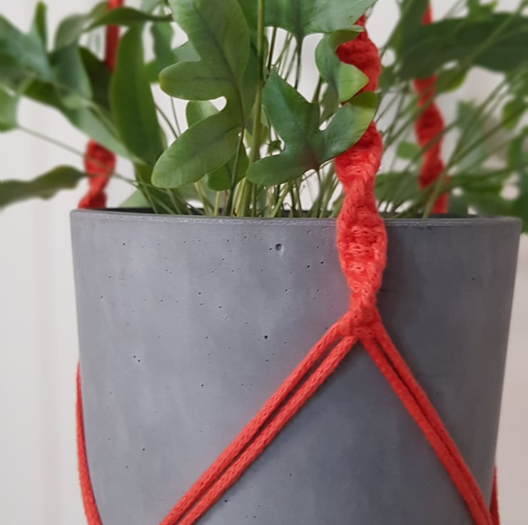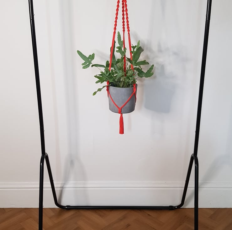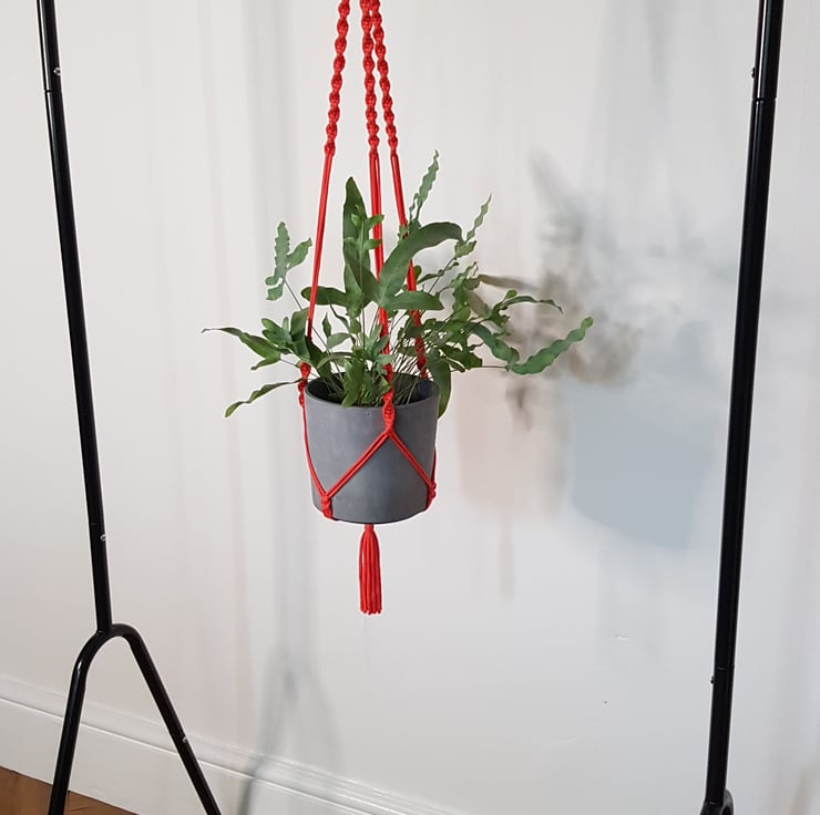 Beautifully handmade Hot Coral Orange Macrame plant hanger medium. This is perfect for any room and takes a small to medium size pot (the one shown in the photos is 15cm in diameter) The hanger is approx 80cm from hoop to end of tassel once in hanging position with a pot inside. Made using 3mm cotton cord, it is super strong so will hold even the longest of hanging houseplants!