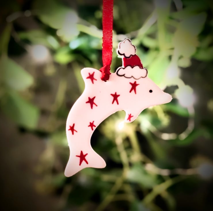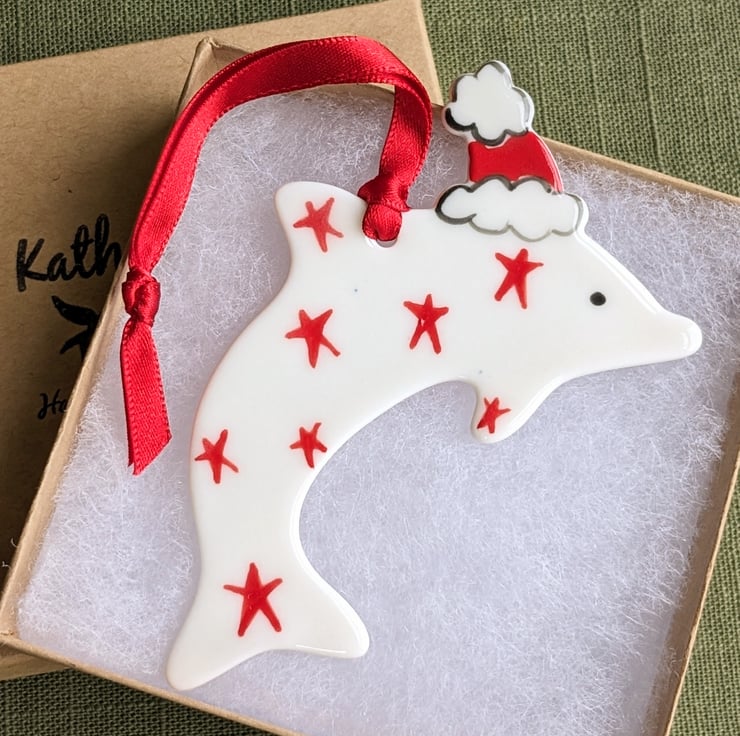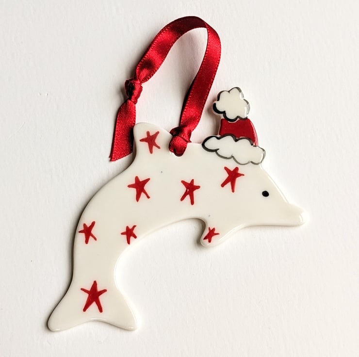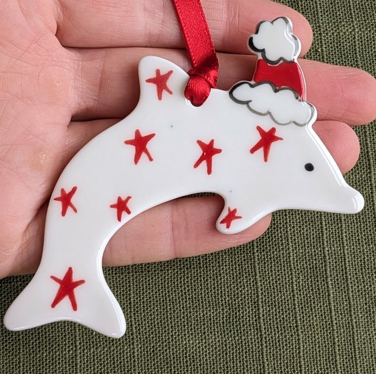 Each dolphin Christmas decoration is hand-crafted in porcelain clay, decorated by hand with red stars and glaze fired to stoneware to give it glossy finish on its front face.
