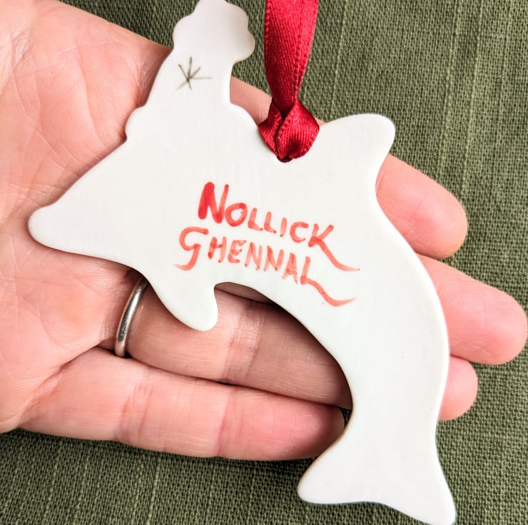 'Nollick Ghennal' has been handpainted on the reverse which means Merry Christmas in Manx Gaelic. This Pottery Christmas decoration is therefore double sided for when it is hanging on a Christmas tree.