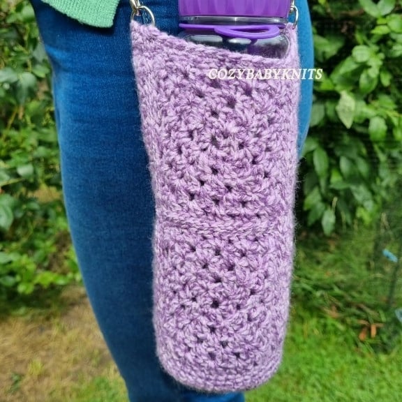 Crossbody bottle bag made with lilac tweed granny squares with removable strap.