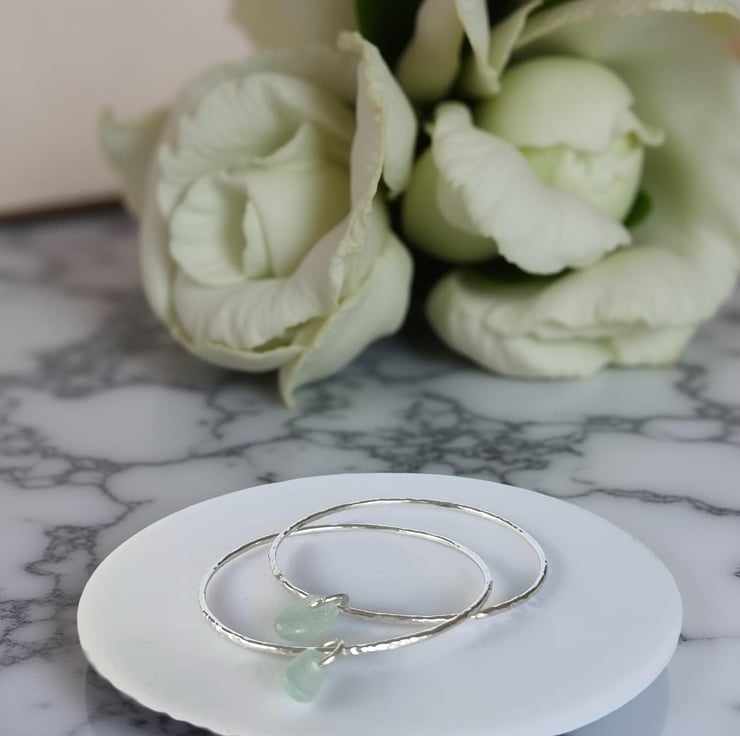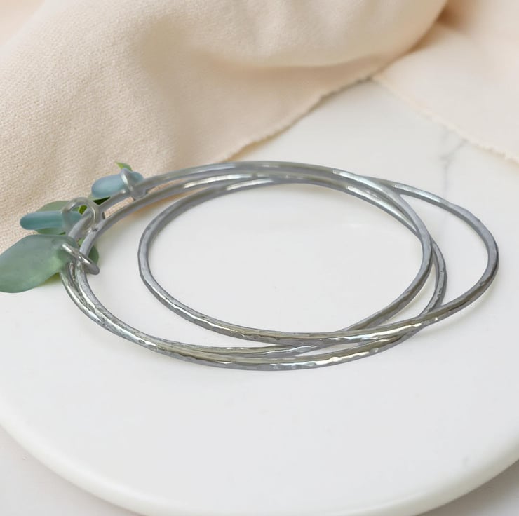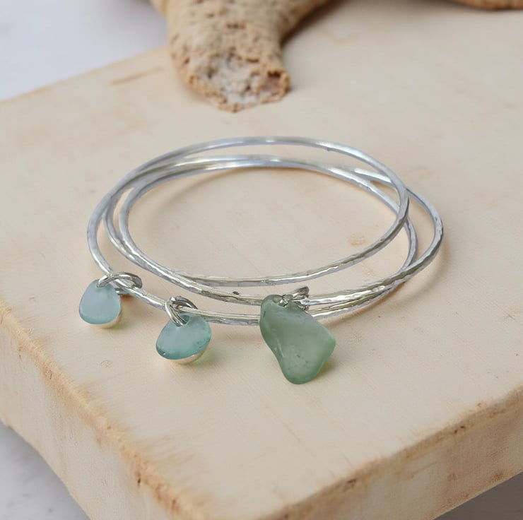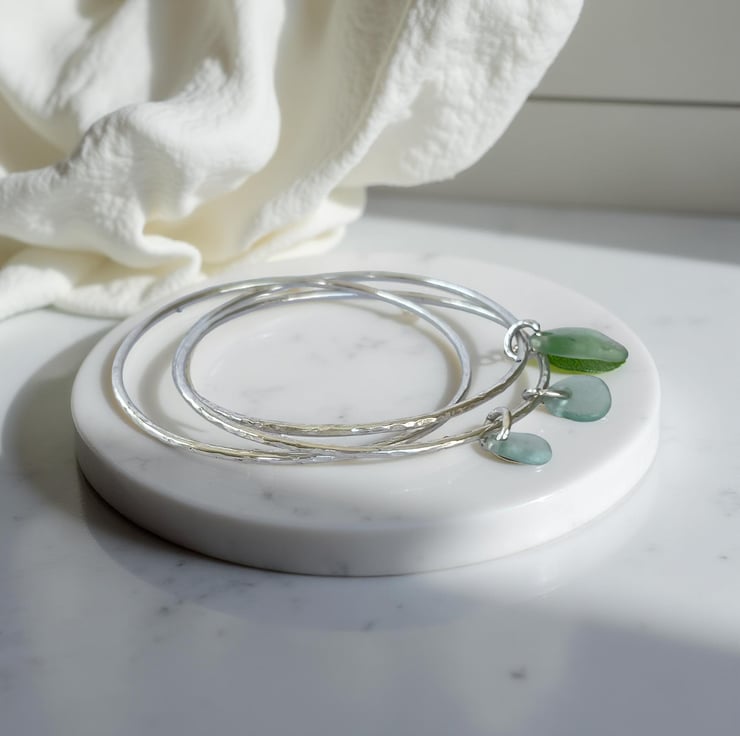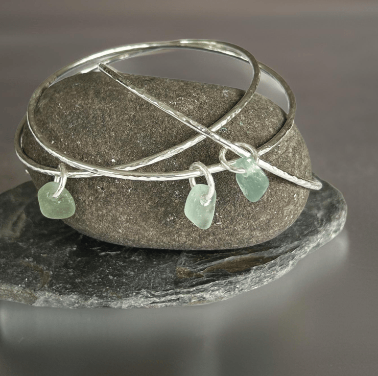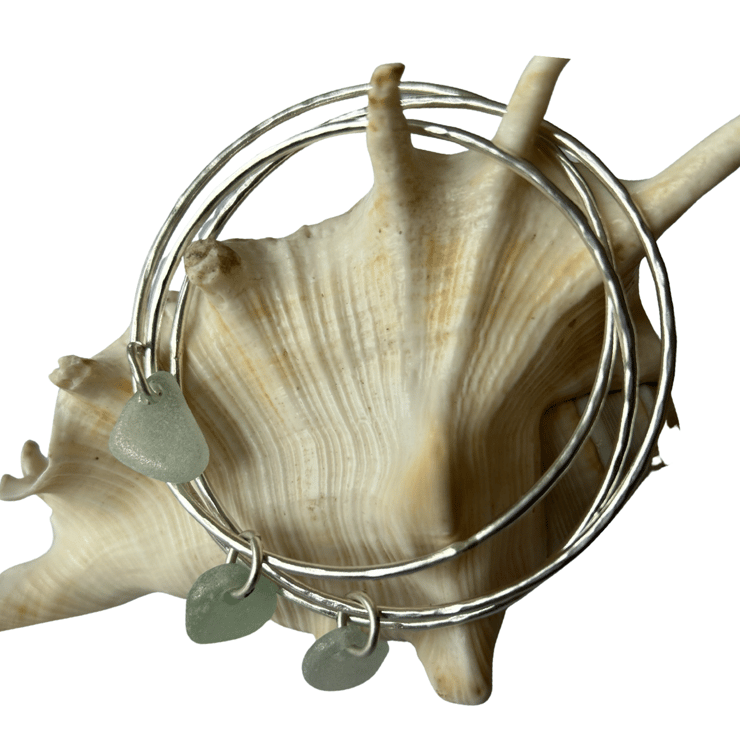 Adding a touch of coastal attraction with seafoam sea glass on each of the three interlinked bangles, evoking the soothing beauty of the ocean. This bangle carries the hallmark of authenticity Birmingham Assay Office, ensuring its quality.